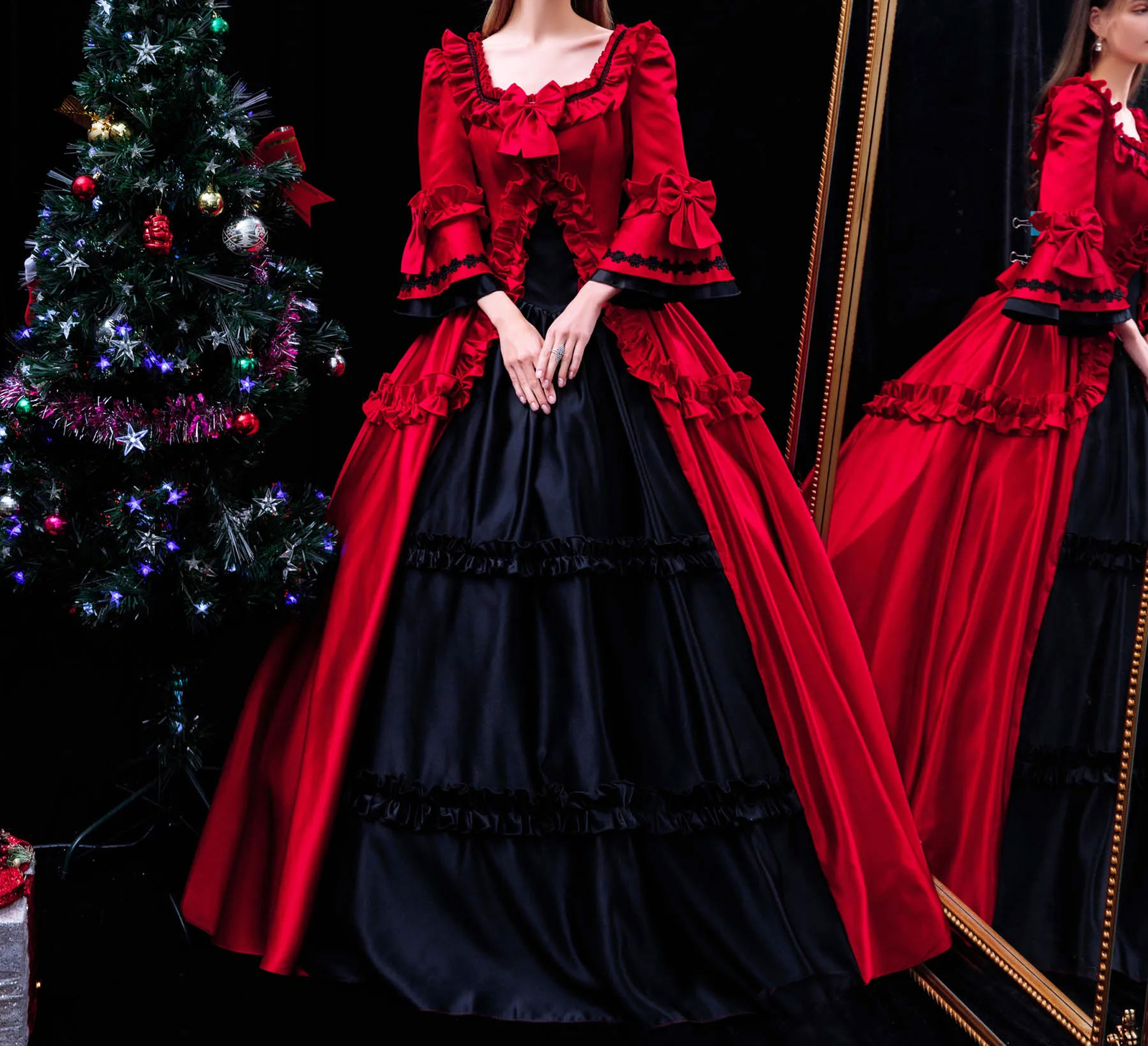 как выглядит Red Gothic Satin Wedding Dresses Long Sleeves Black Lace Ball Gown Bridal Gowns фото