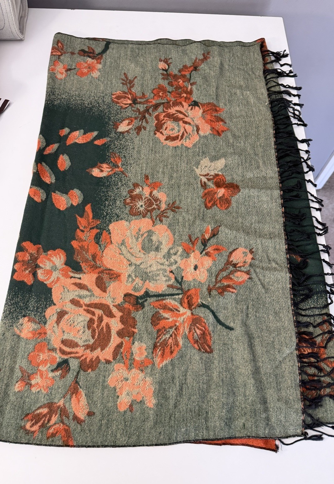 Pashmina 100 Cashmere Scarf Shawl Wrap Green Floral Reversible Black Fringe NWT