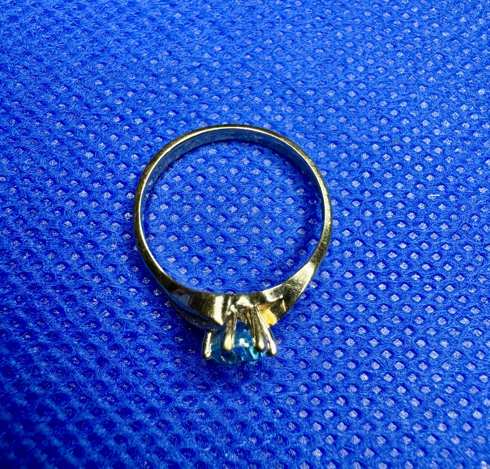 как выглядит 14K Yellow Gold 7x5mm Oval-Cut Blue Topaz Sz. 6.5 Textured Bypass Ring, 2.22g фото