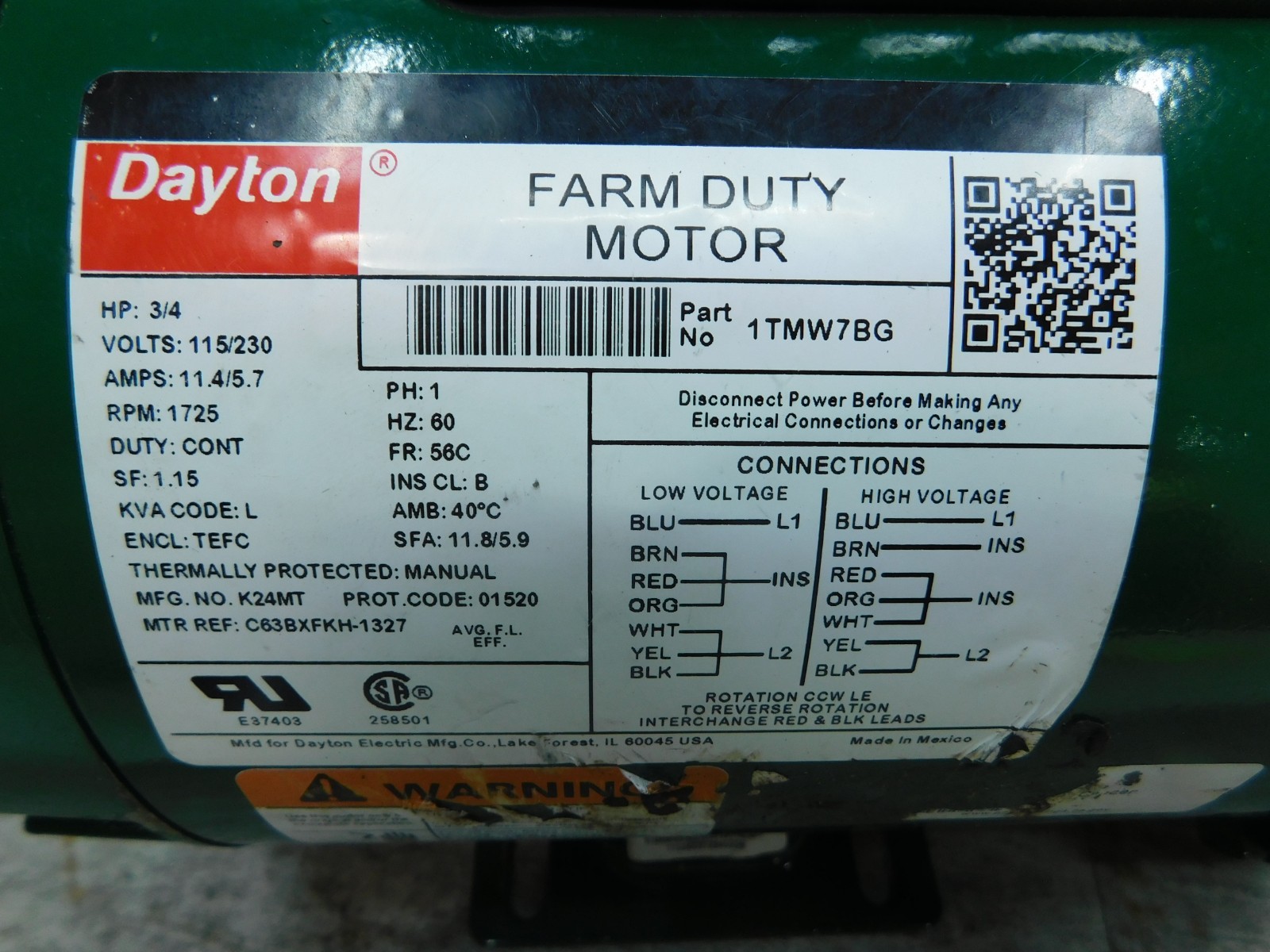 3/4 HP NEW Dayton Electric Motor, Farmer Duty 115/230 V, 1725 RPM, TEFC, 1TMW7BG