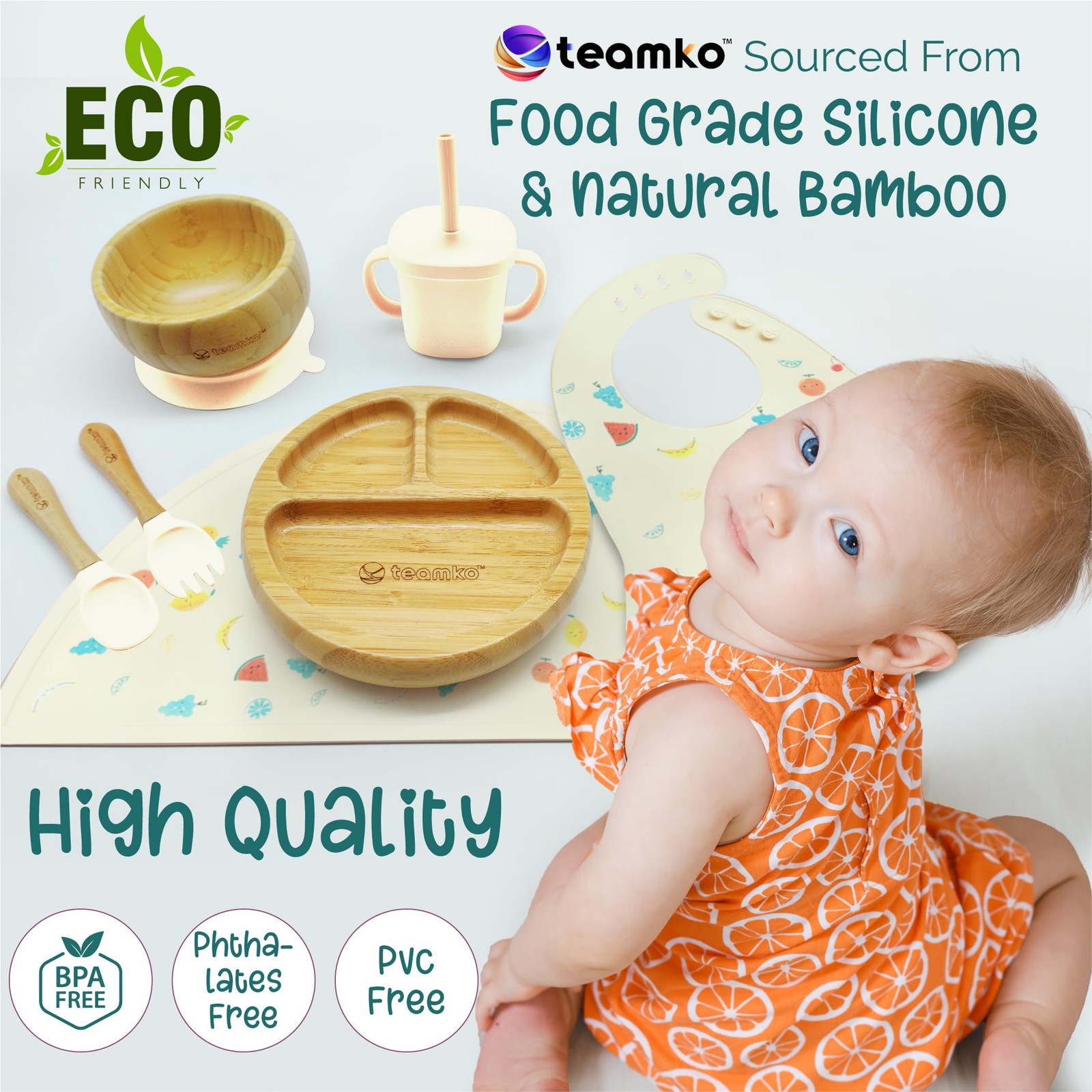 Silicone Baby Feeding Set: Bamboo Baby Plate and Bowl, Bib, Utensils, Cup ...