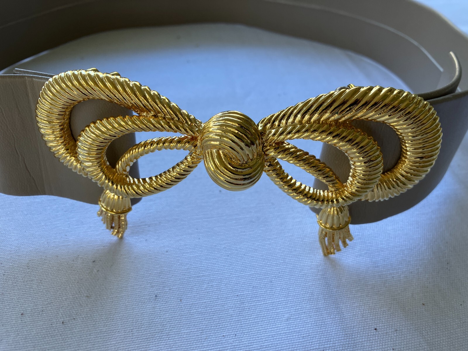 Vtg Mimi Di N 1990 Golden Metal Bow Tussles Buckle Faux Leather Belt Adjustable