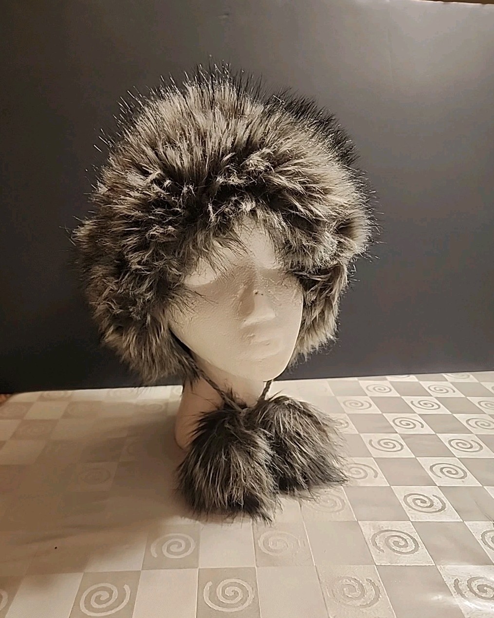 Womens Warm Winter Hat Gray Silver Faux Fur Knitted Lined With Pompons