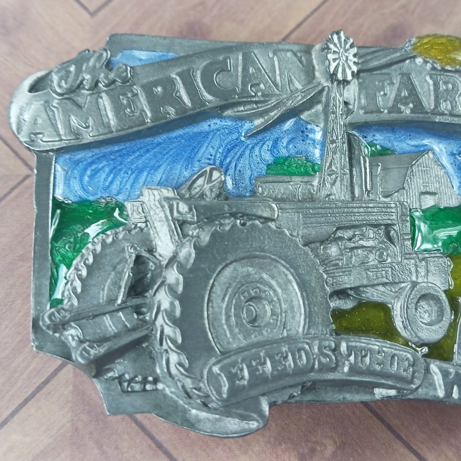 как выглядит The American Farmer Feeds the World Belt Buckle Siskiyou E-27 Tractor Barn Cow фото