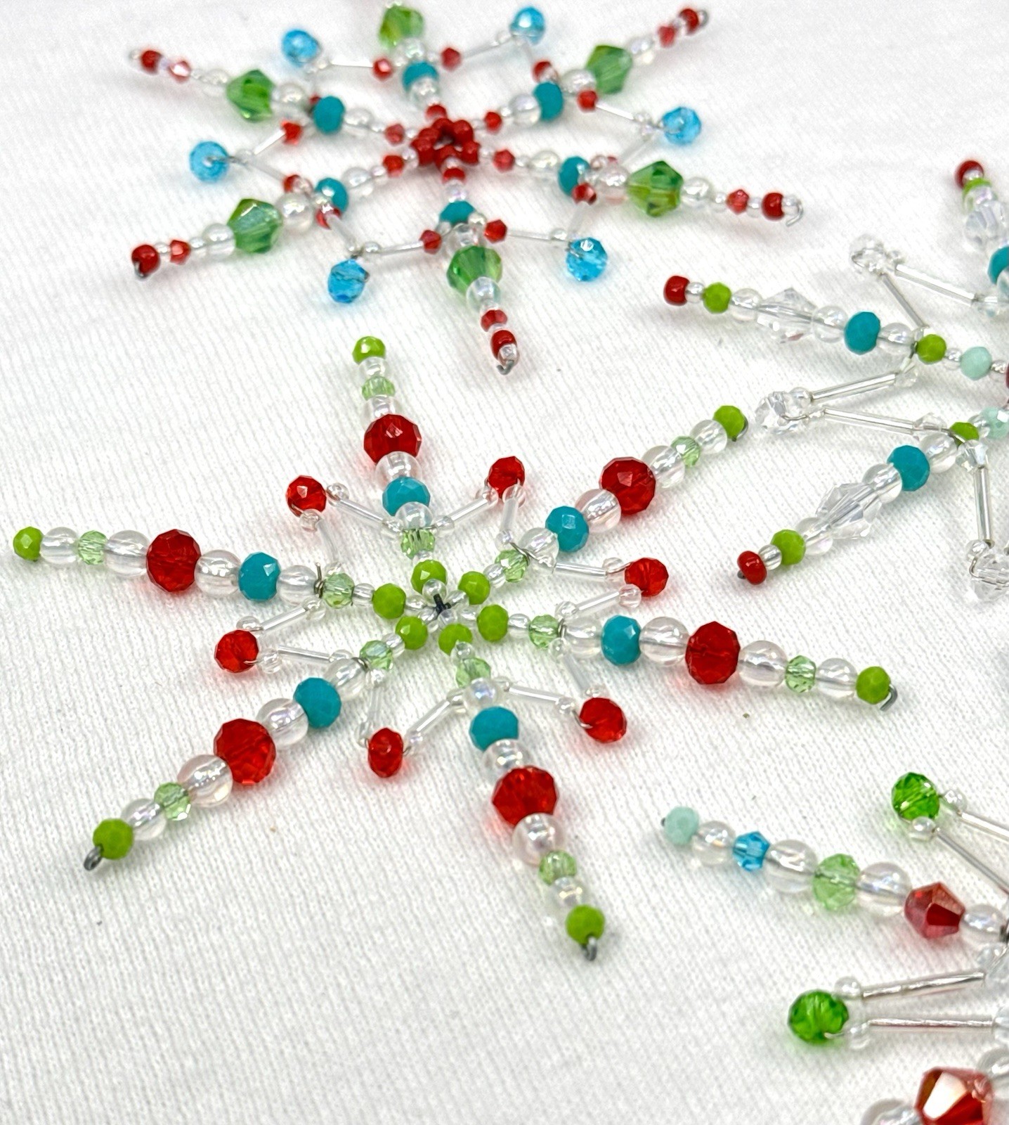 Handcrafted beaded glass snowflake Christmas ornaments. Set of four. 4 to 6 in