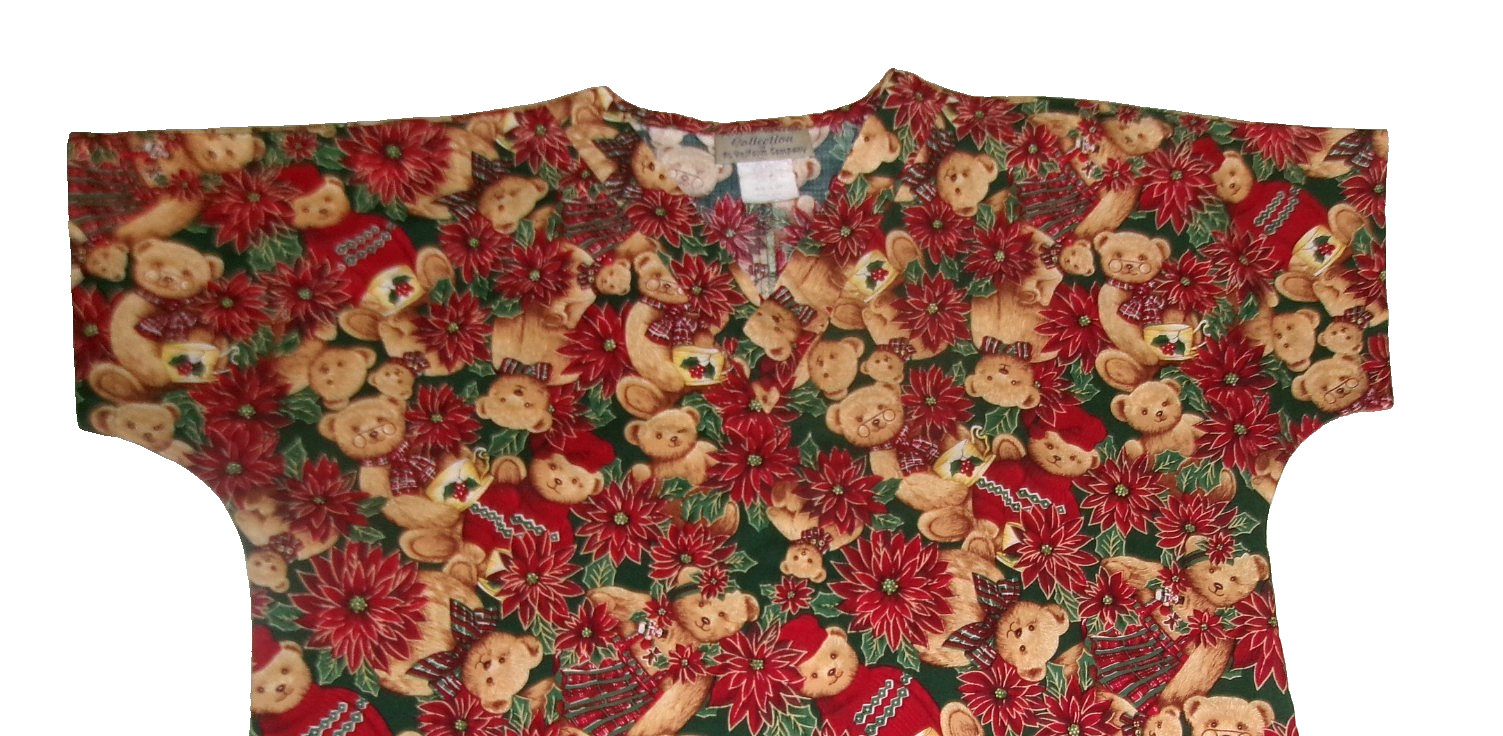 Christmas Scrub Women Sz Medium Poinsettia Teddy Bears 2 Pockets - Gently Used