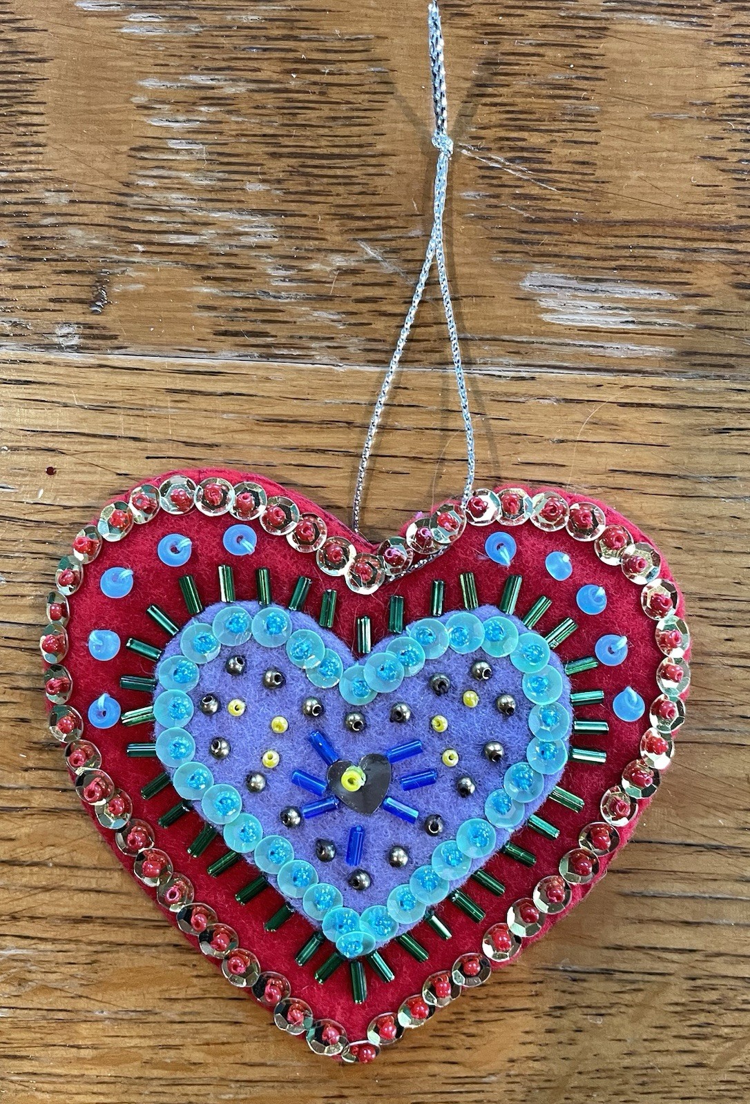 Red Purple Felt Heart Valentine s Day Ornament w/ Colorful Beads Sequins