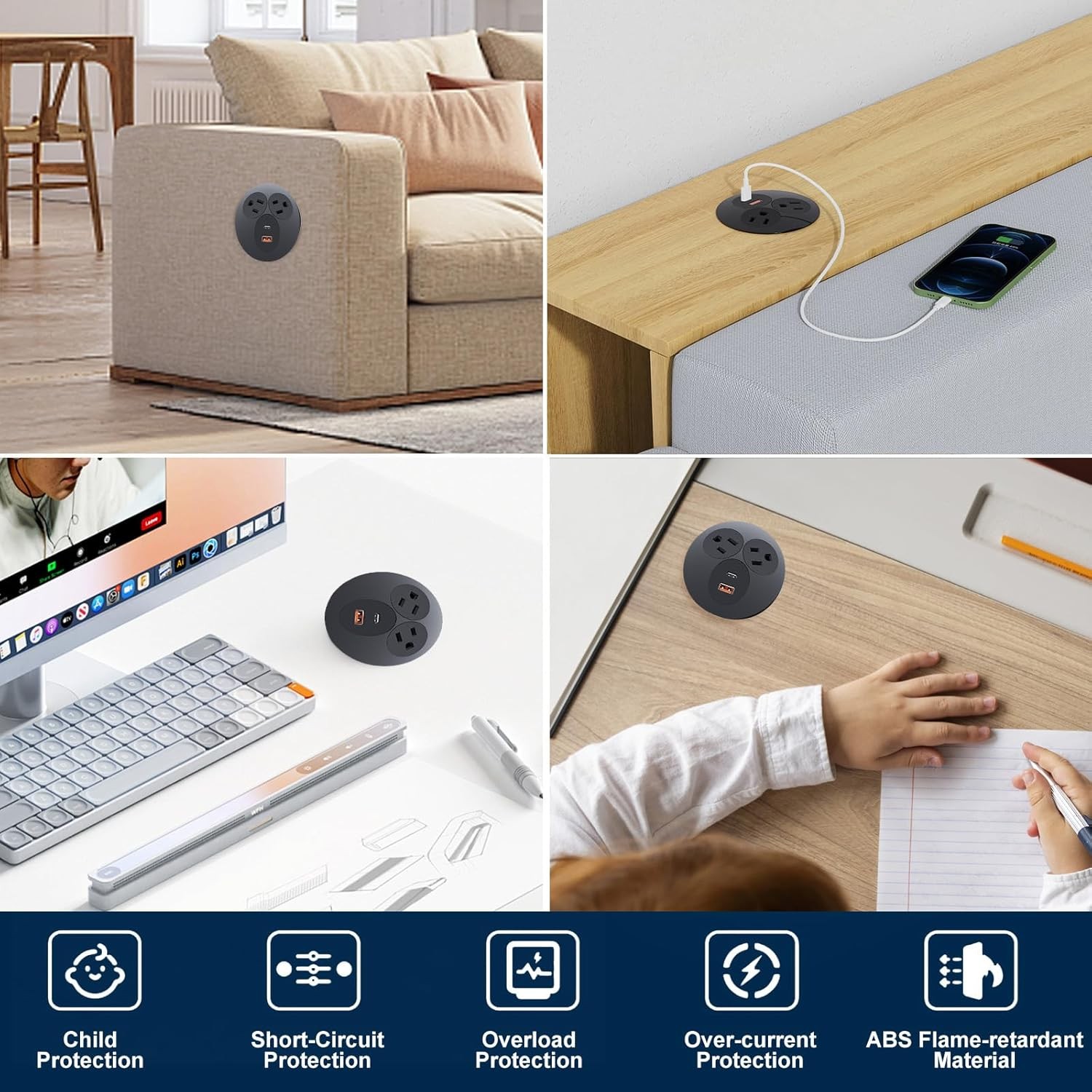 Desk Power Grommet with PD 20W USB-C Port Fast Charging Station USB-A Port,De...