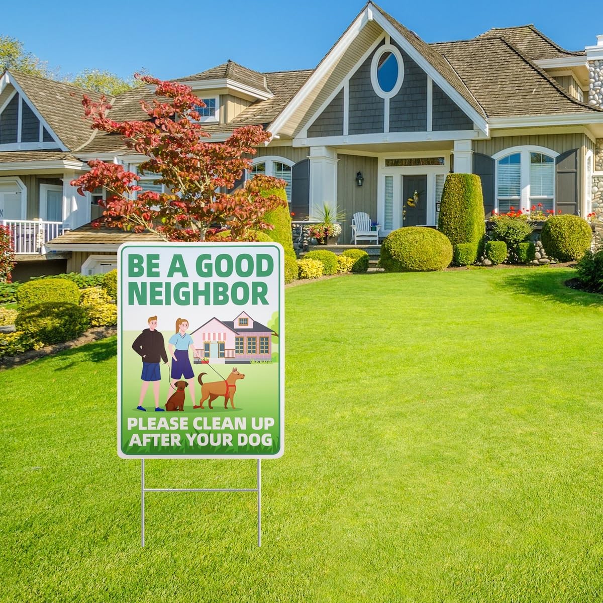 Clean Up After Your Dog Signs, 2 Pack 12x9 with Metal H-Stakes For Yard Double