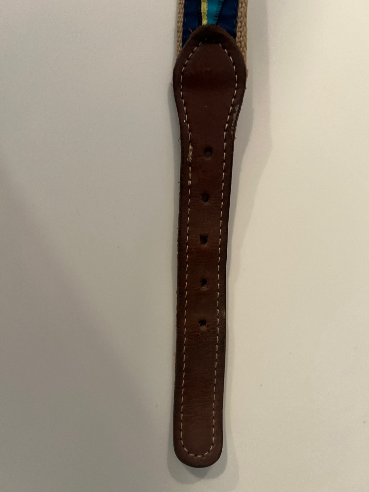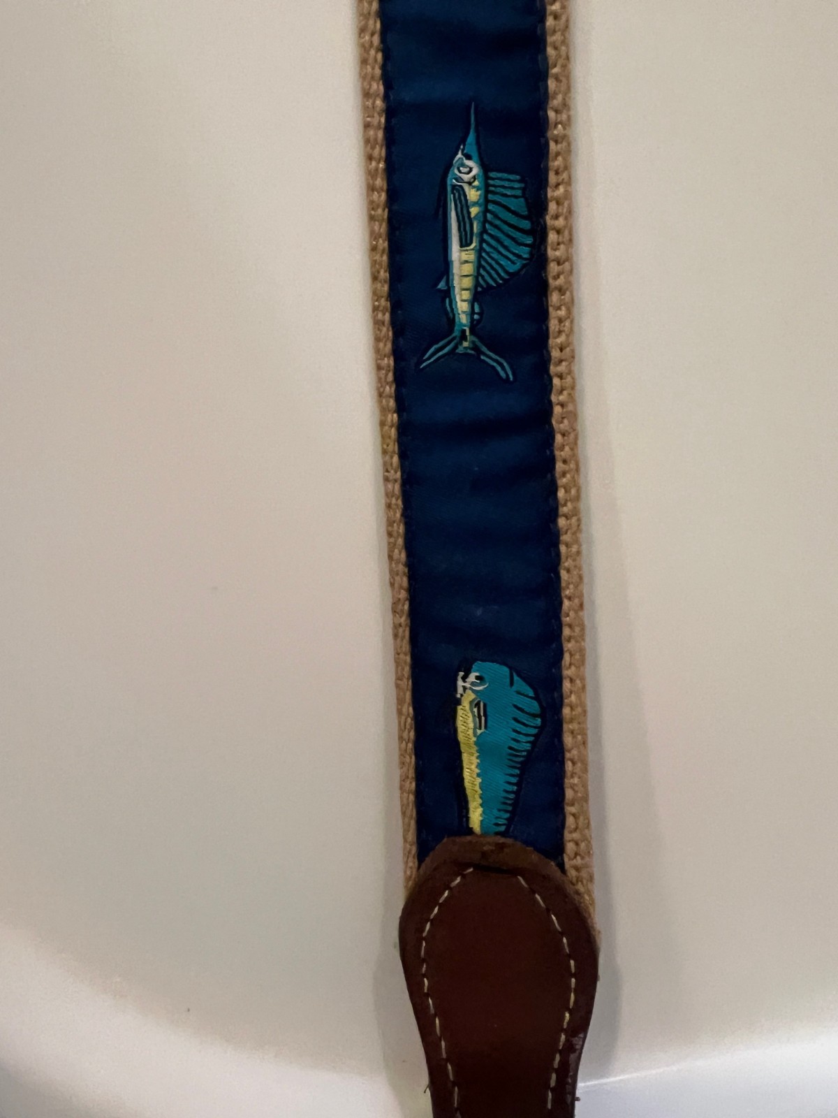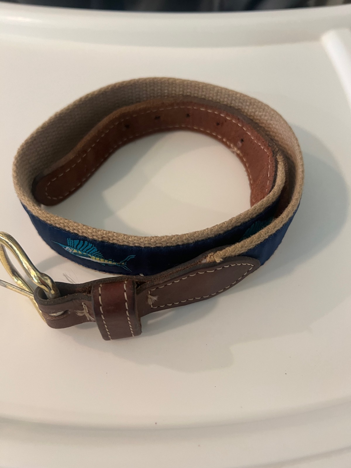 как выглядит Leather Youth Belt Embroidered Canvas Size 22 Marlin Dolphin Nautical Brass CUTE фото