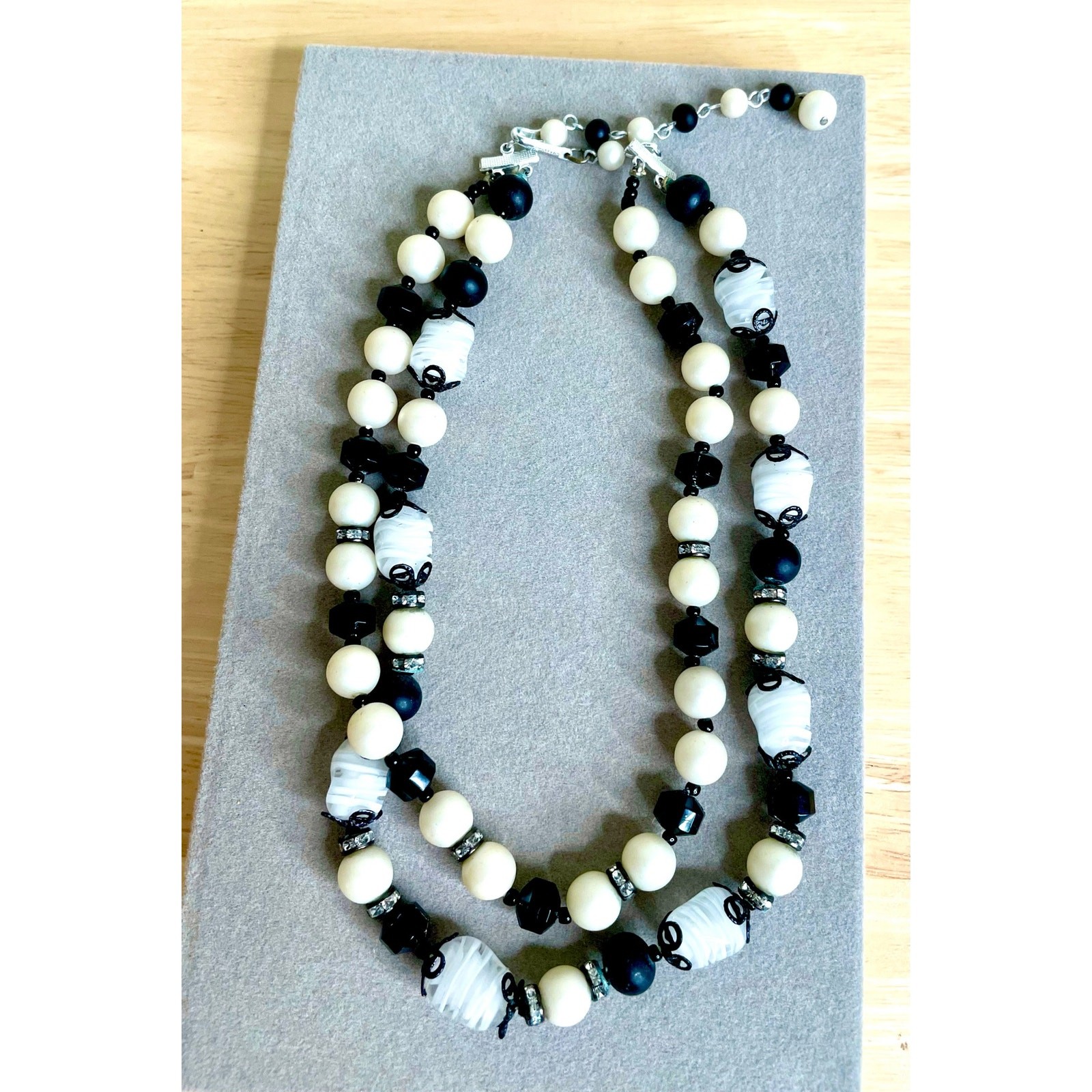 как выглядит Vintage Signed Japan Black White Glass Stone Faux Pearl Layered Choker Necklace фото