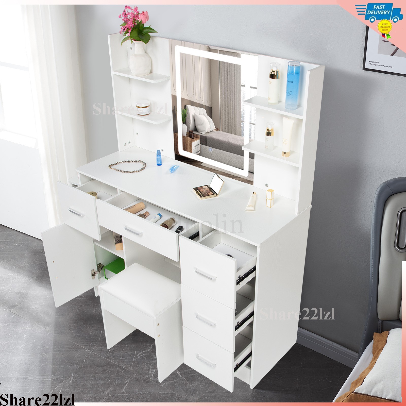 Makeup Vanity Table Set with LED Mirror Dressing Table Drawers Shelves Stool