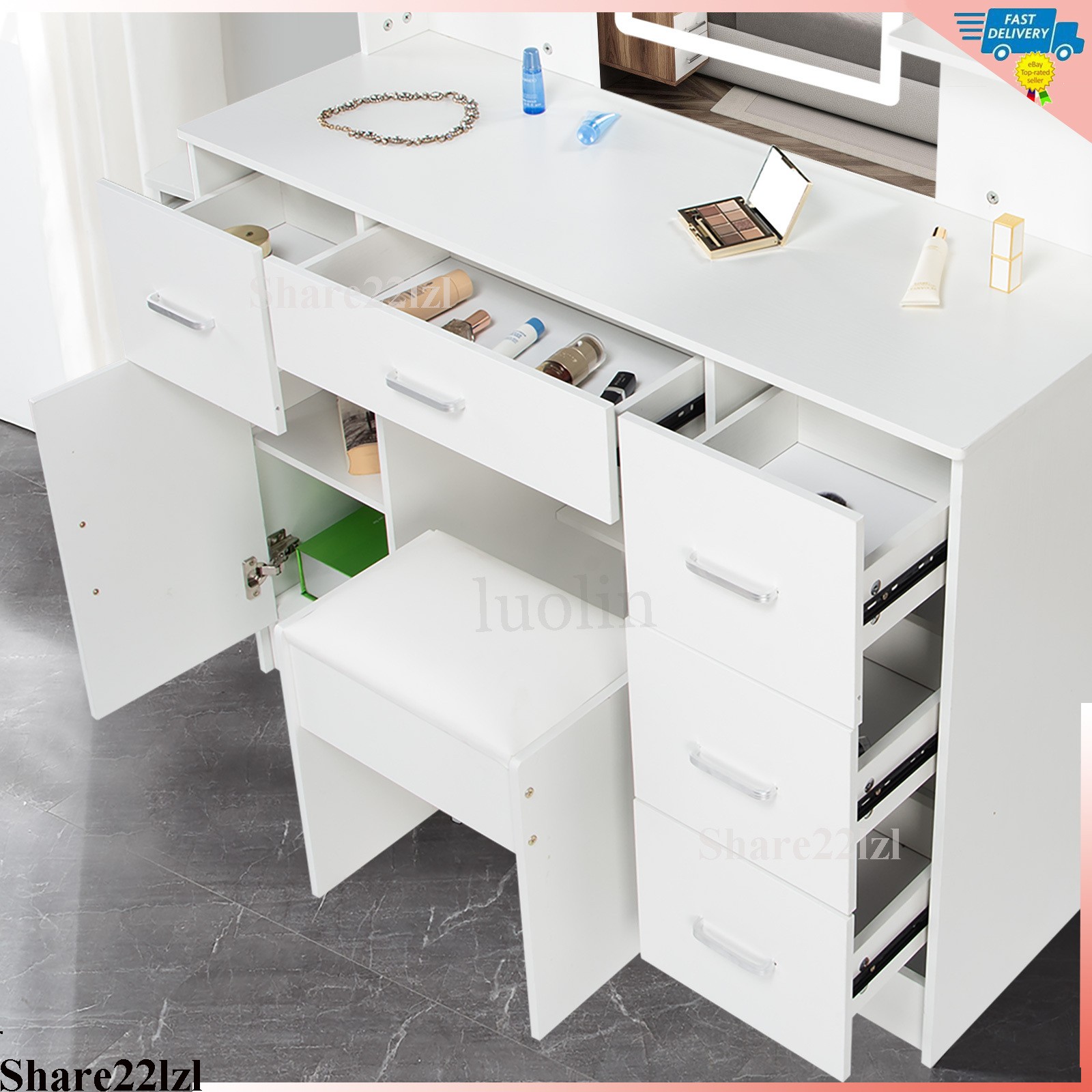 как выглядит Makeup Vanity Table Set with LED Mirror Dressing Table Drawers Shelves Stool фото