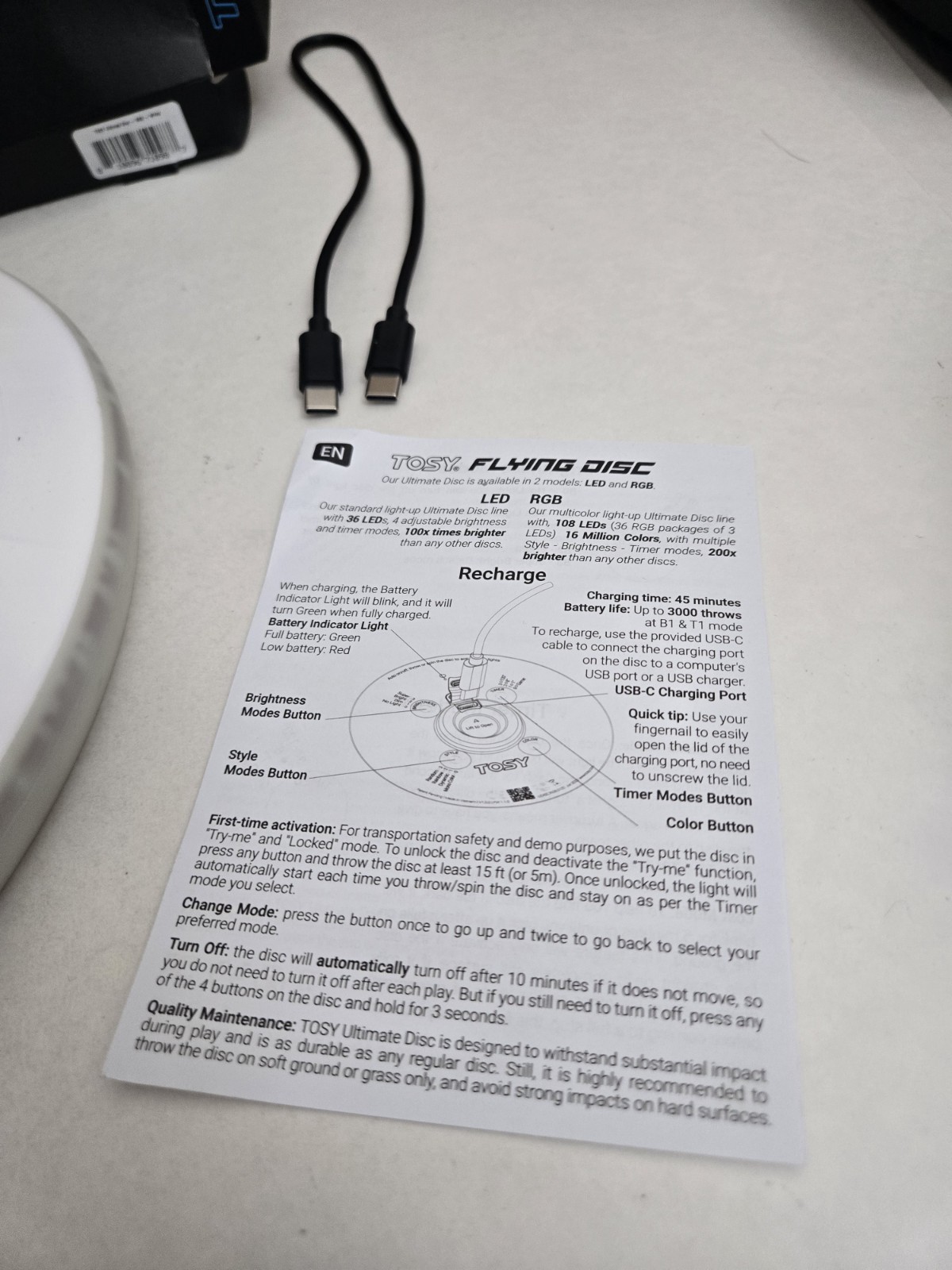 TOSY Flying Disc 16 Million Color RGB Rechargeable Frisbee Open Box