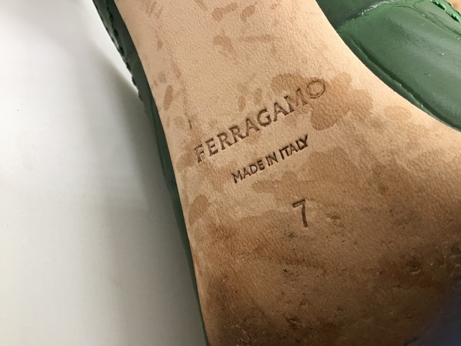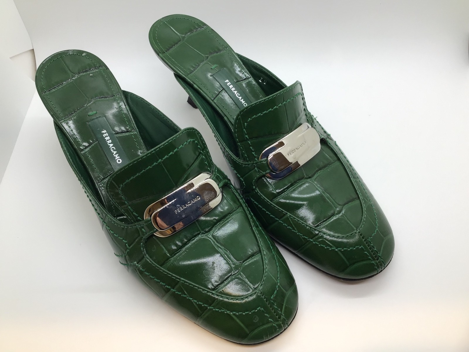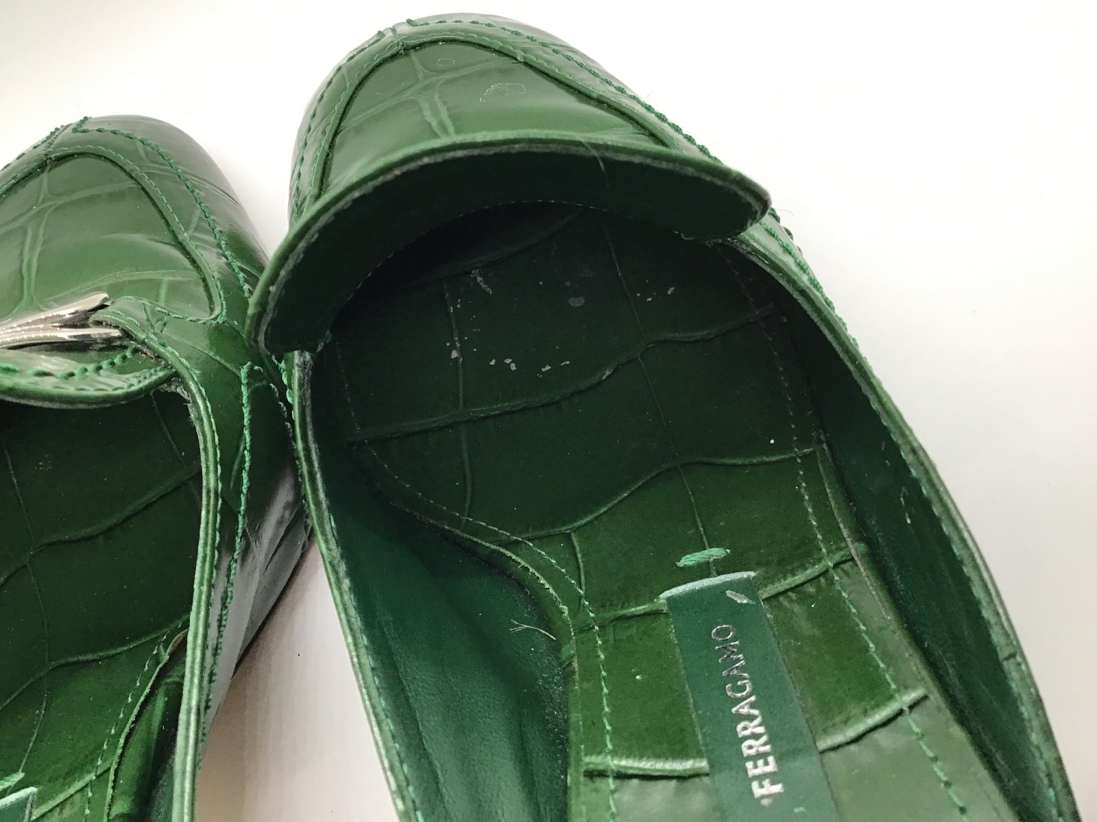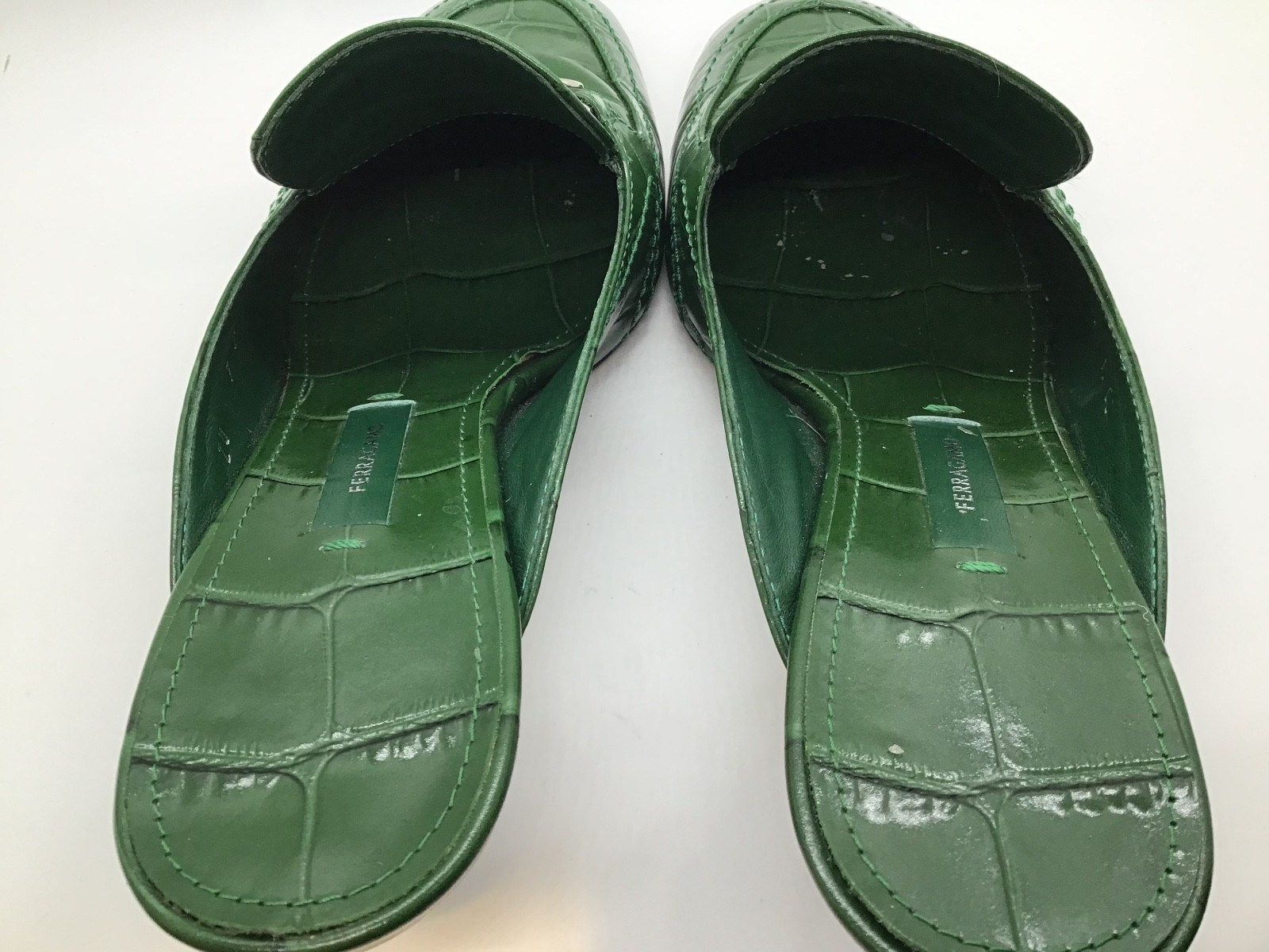 как выглядит Salvatore Ferragamo Green Croc Embossed Mules 7.5 w/ Box Dust Bags Set фото