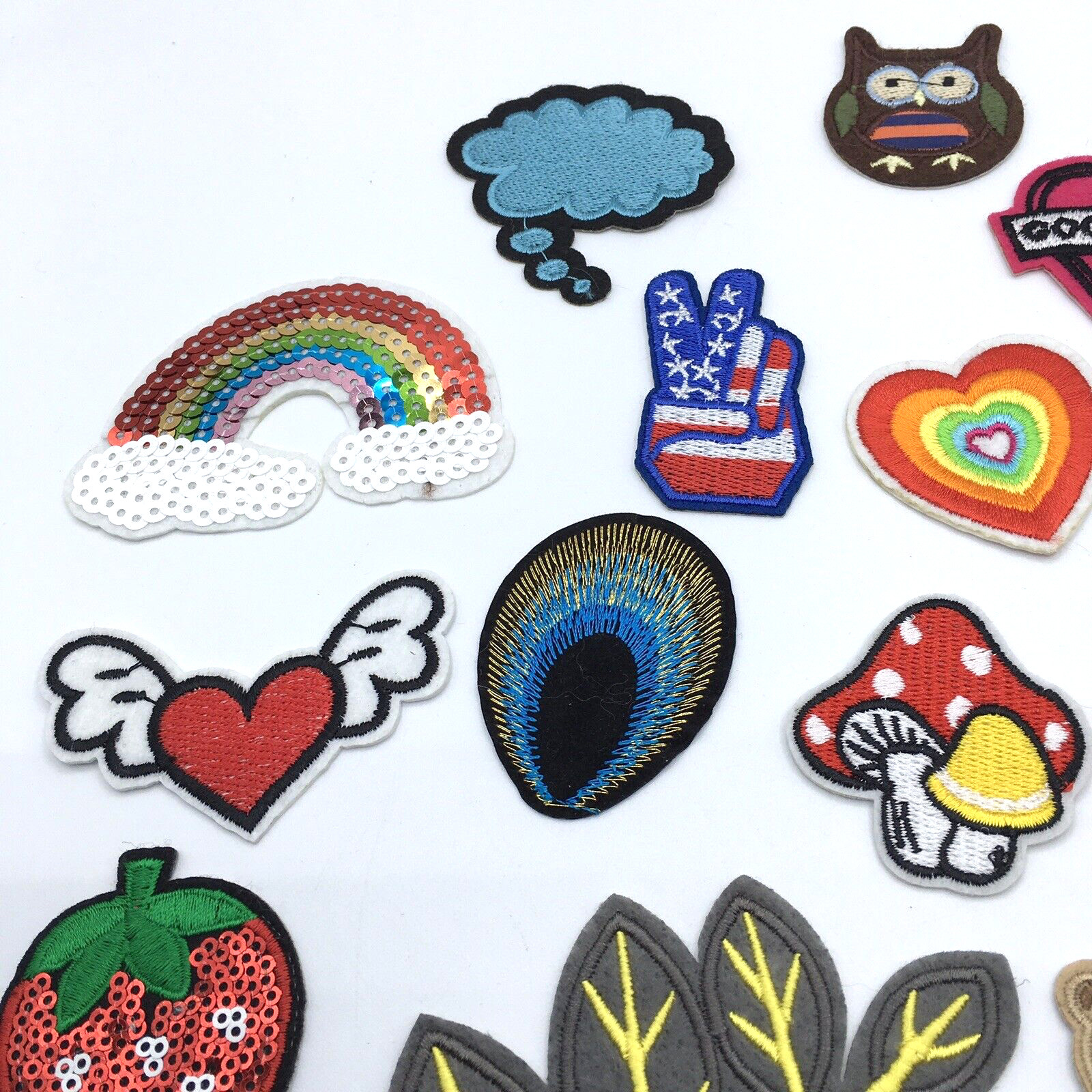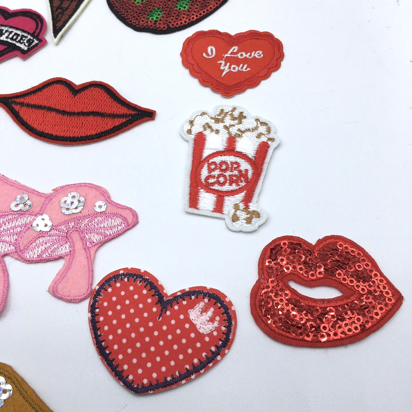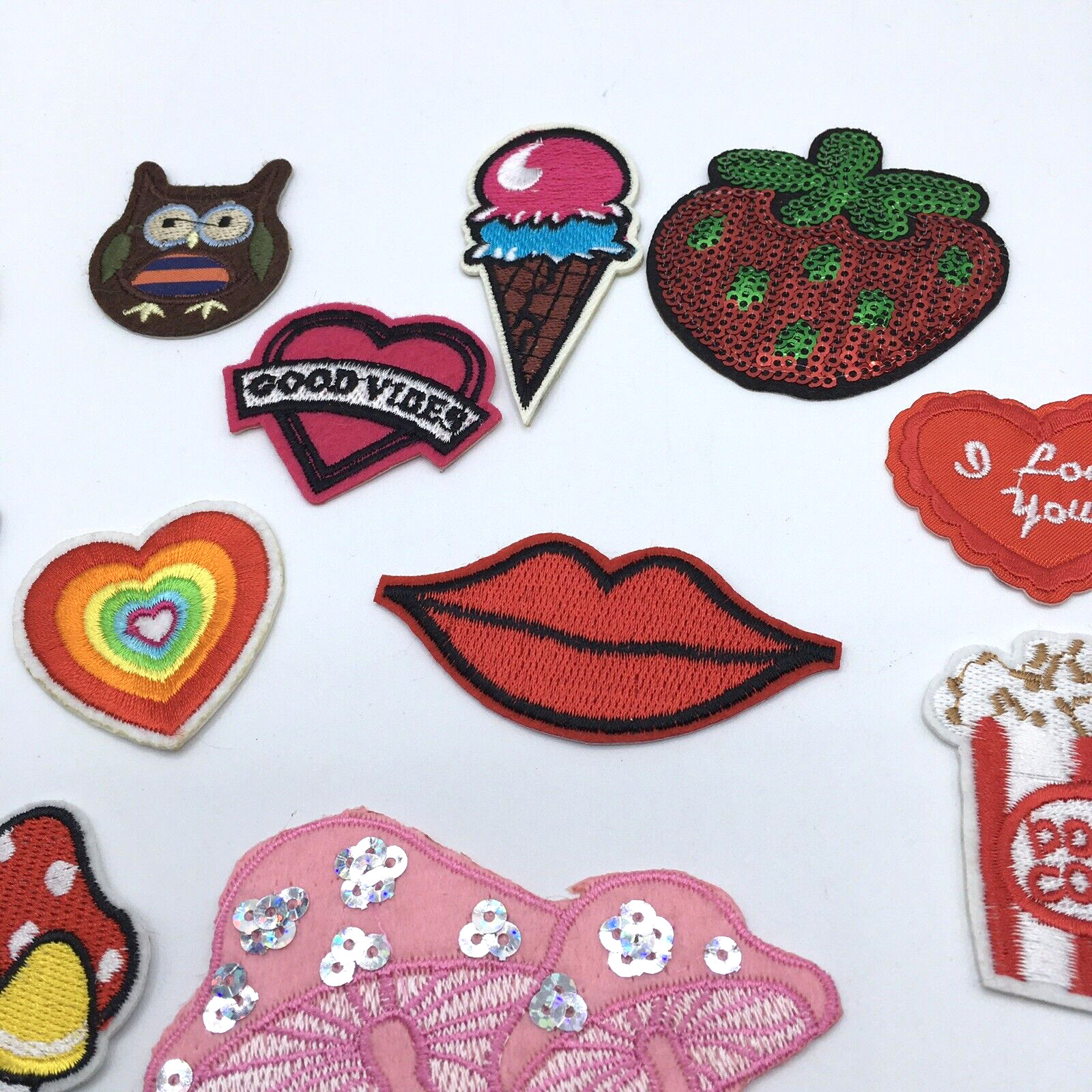 Assorted Lot Of 21 Iron On Patches Mushroom Heart Pop Corn Kiss Rainbow Owl