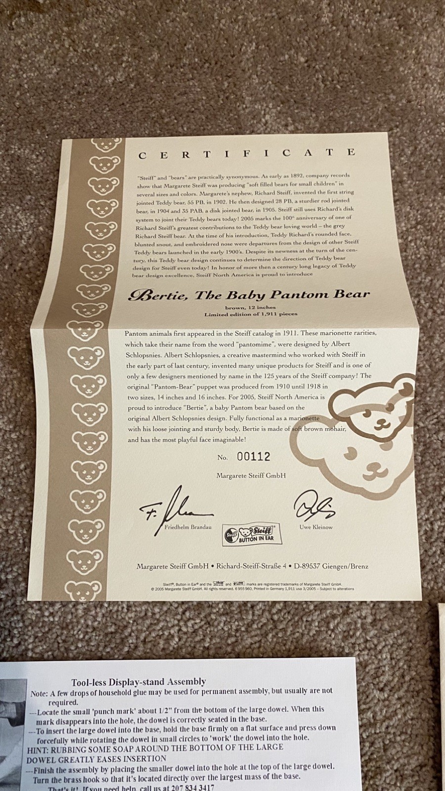 Steiff 667947 - Bertie, The Baby Pantom Bear Marionette 2005 - New in Box w/ COA