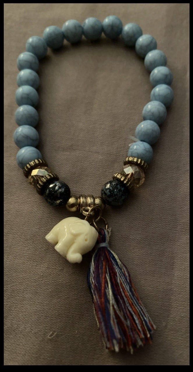 7 - 9 Stretch Beaded Bracelet White Lucky Elephant Tassel Light Blue Beads