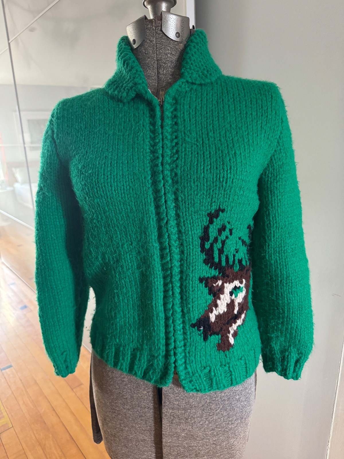 как выглядит 60s vtg small hand knit GREEN deer cowichan full zip sweater Mary Maxim design фото