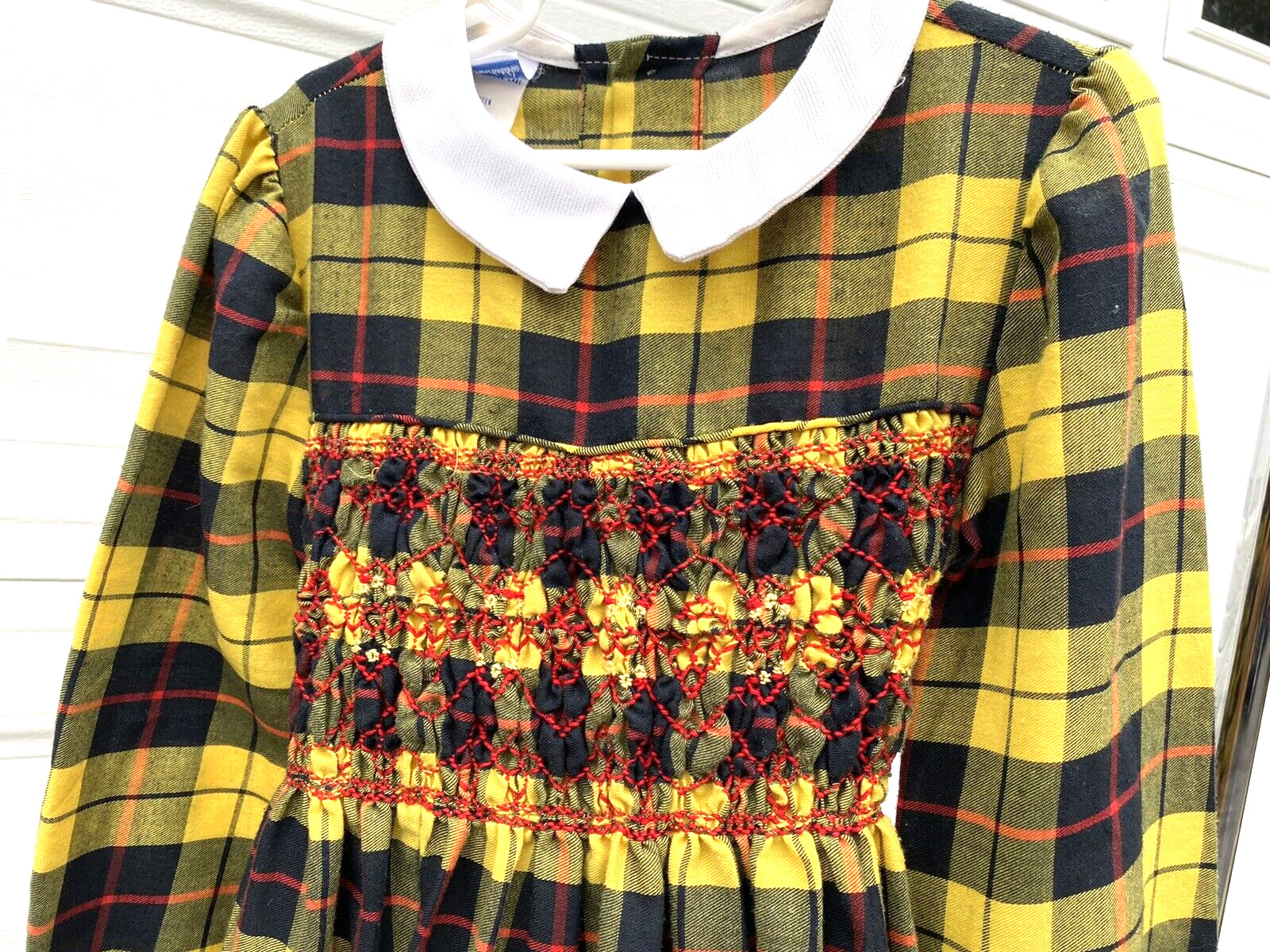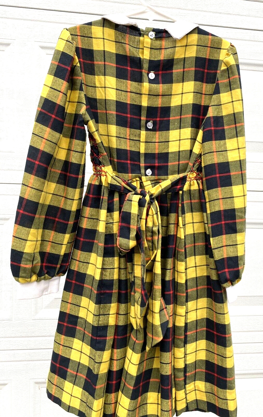 VTG Polly Flinders Yellow Big Plaid LS Dress w Fancy Hand Smocking Size 7 MODEST