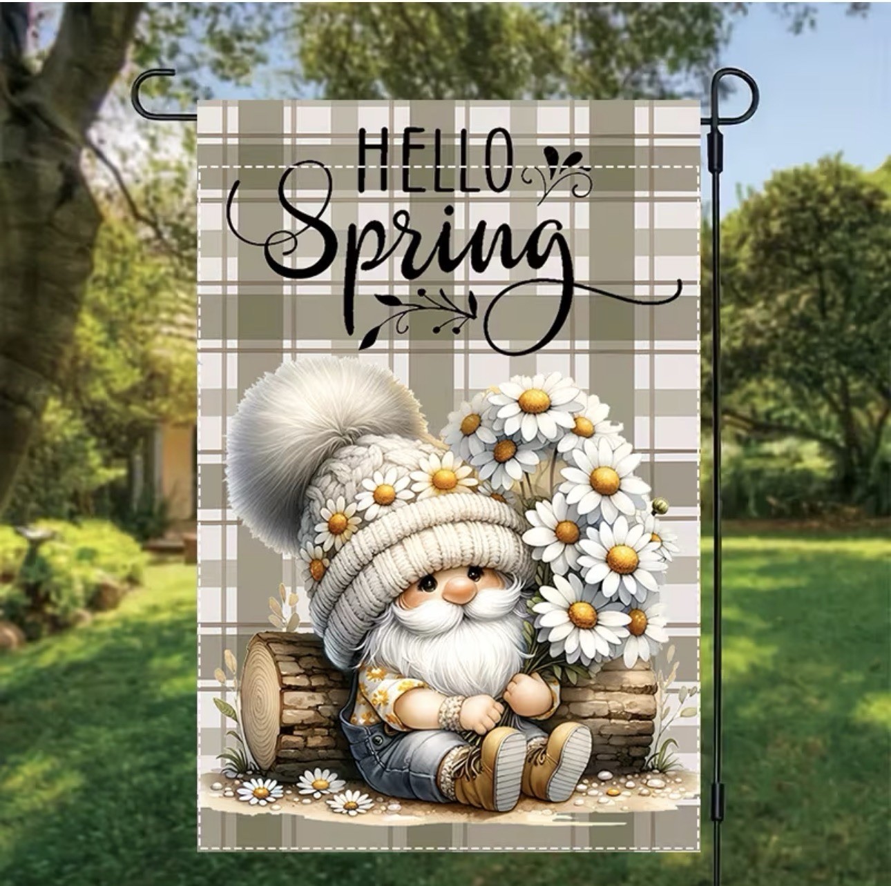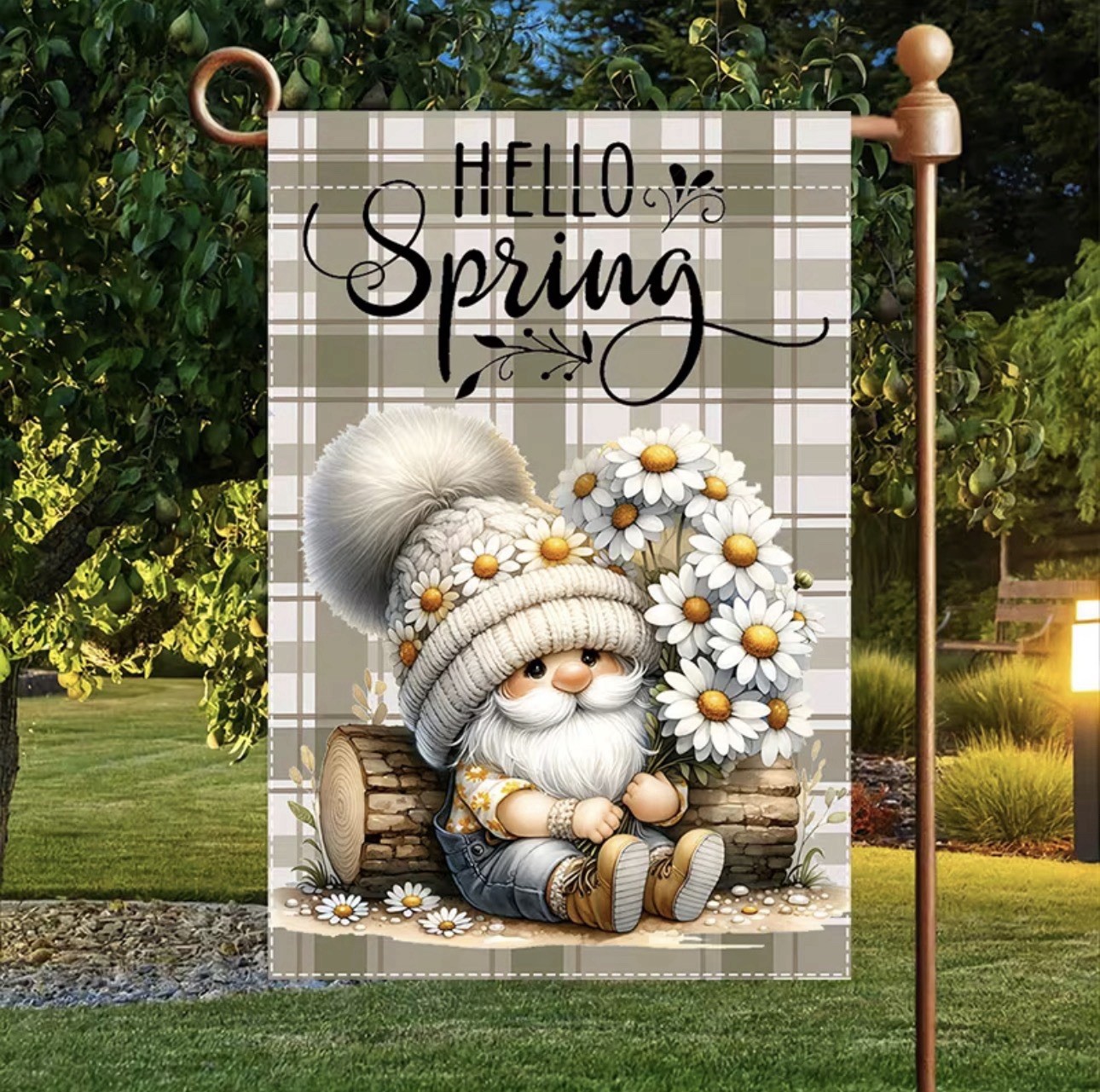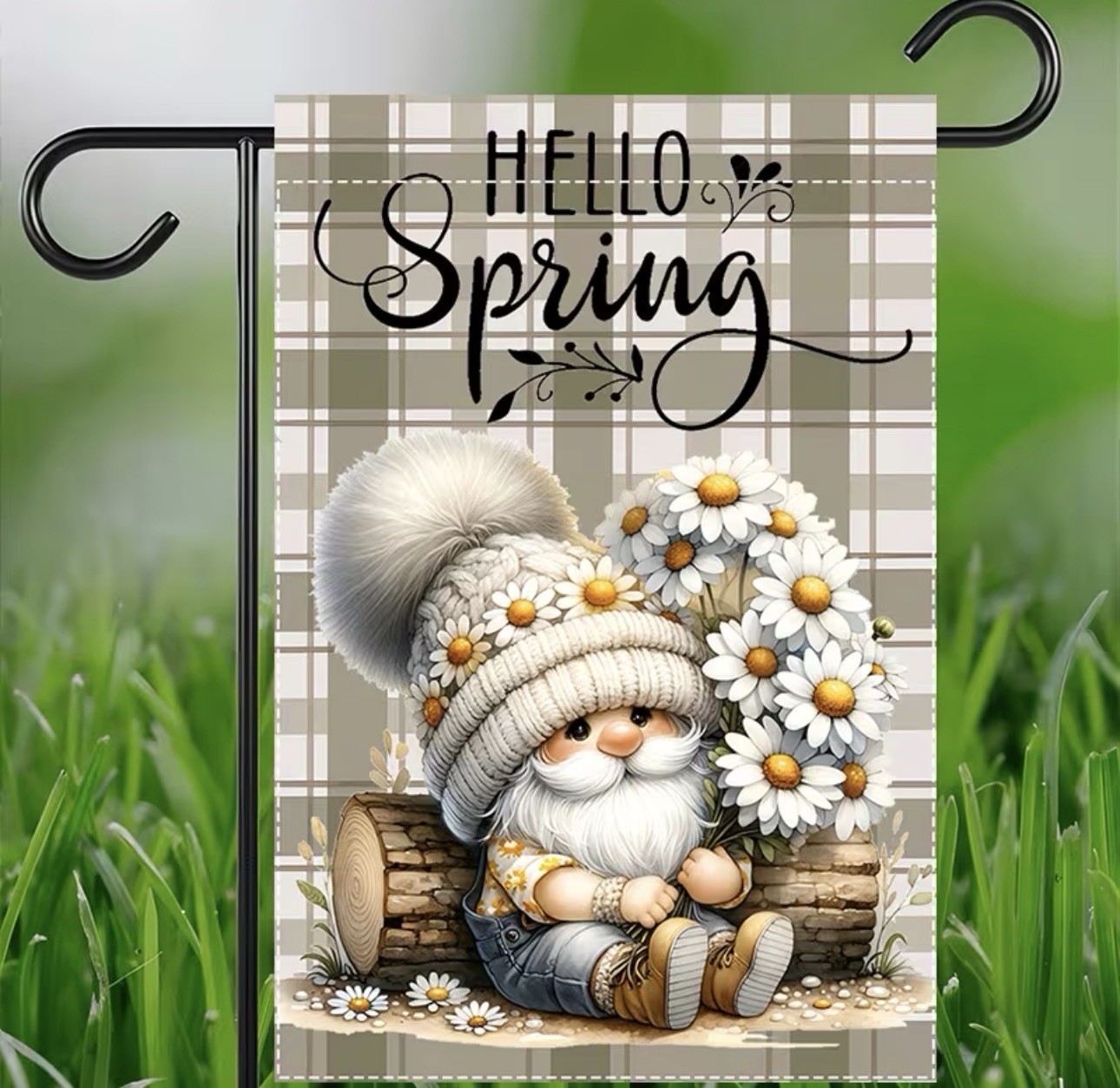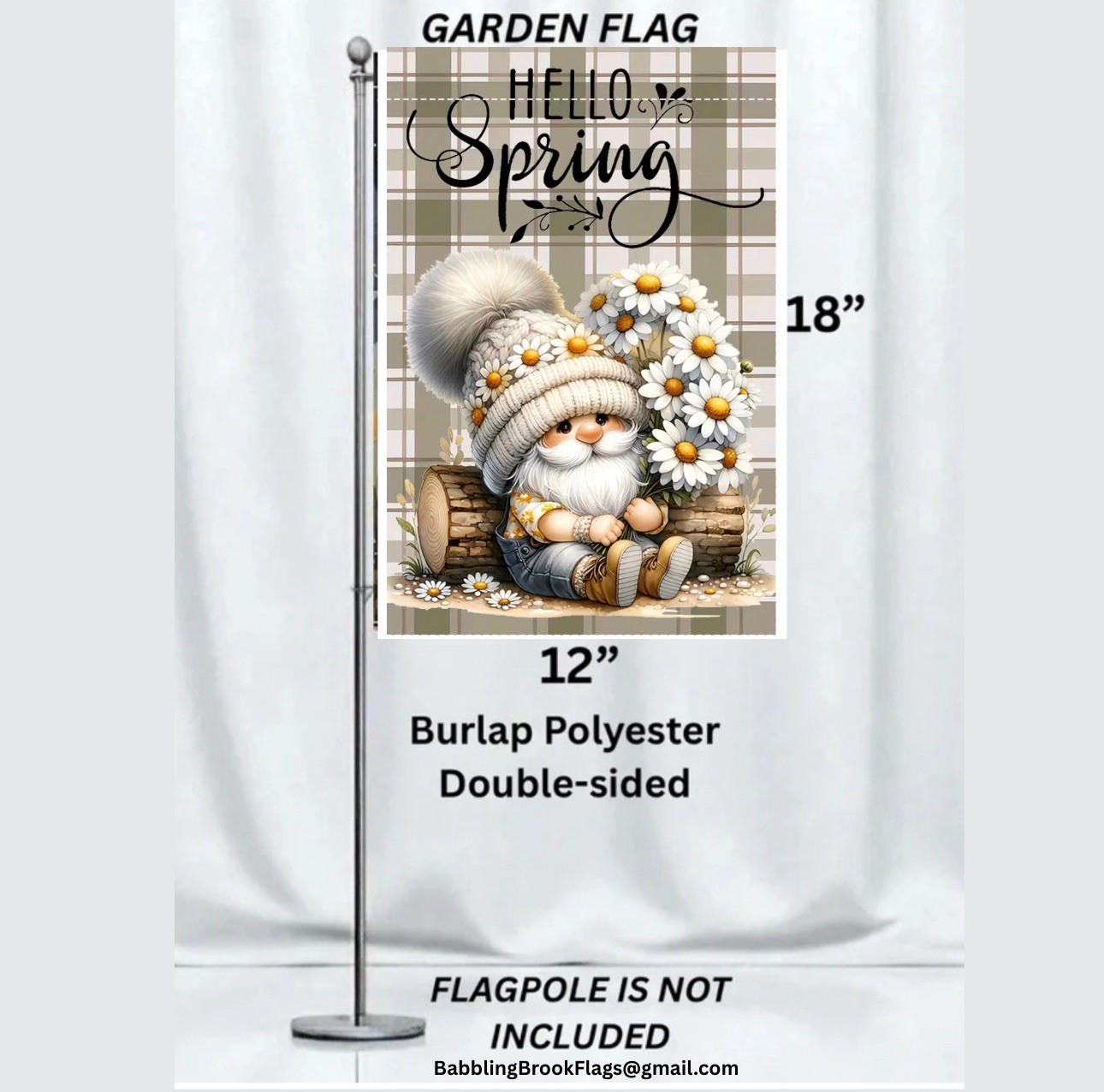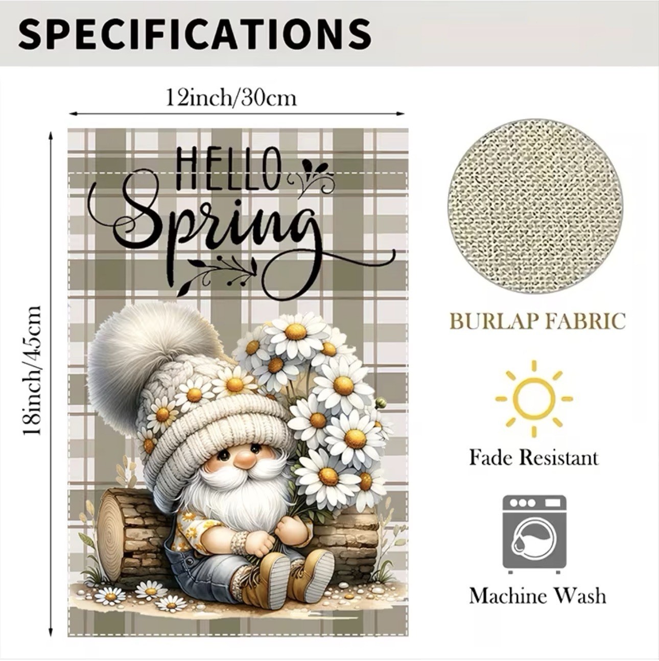 Garden Flag, 12 x18 , Hello Spring Gnome, Thick Burlap Polyester Doublesided