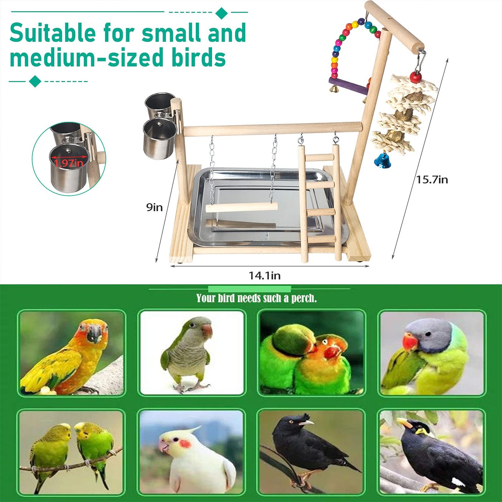 Wooden Bird Play Stand for Parrots Cockatiels Conures with Chew Toys and Swings