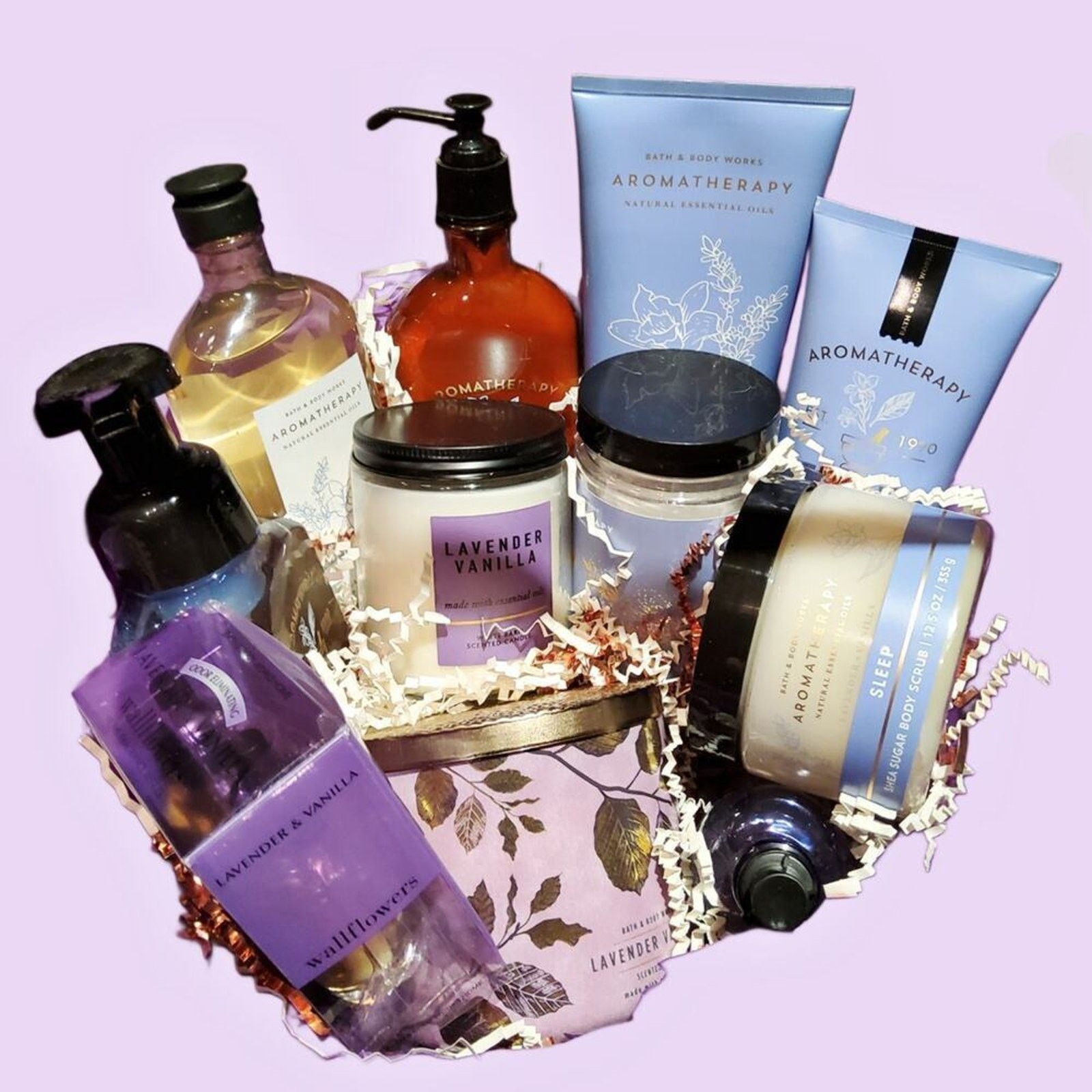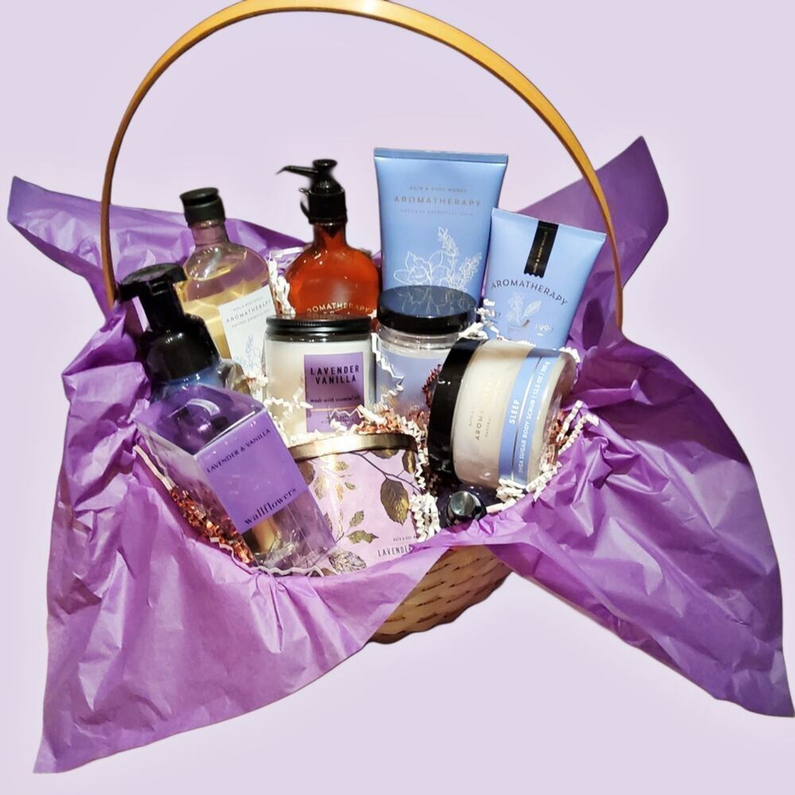 LAVENDER VANILLA BATH AND BODY BASKET AROMATHERAPY 11 PC WASH LOTION SOAP MIST