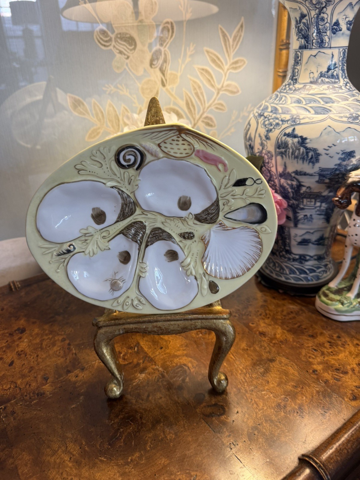• Majolica Oyster Plate Barbotine Shells Cream White Gold Trim