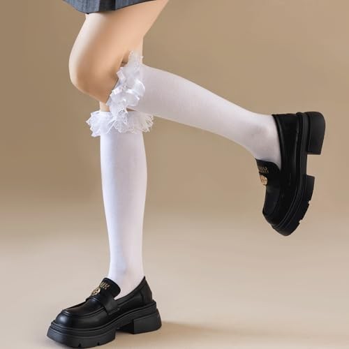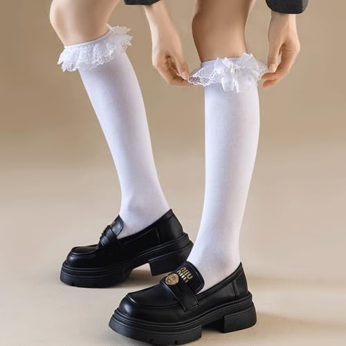 Women's Lace Ruffle Frilly Ankle Socks - Girl Knee Cotton White-1 Pairs-bow