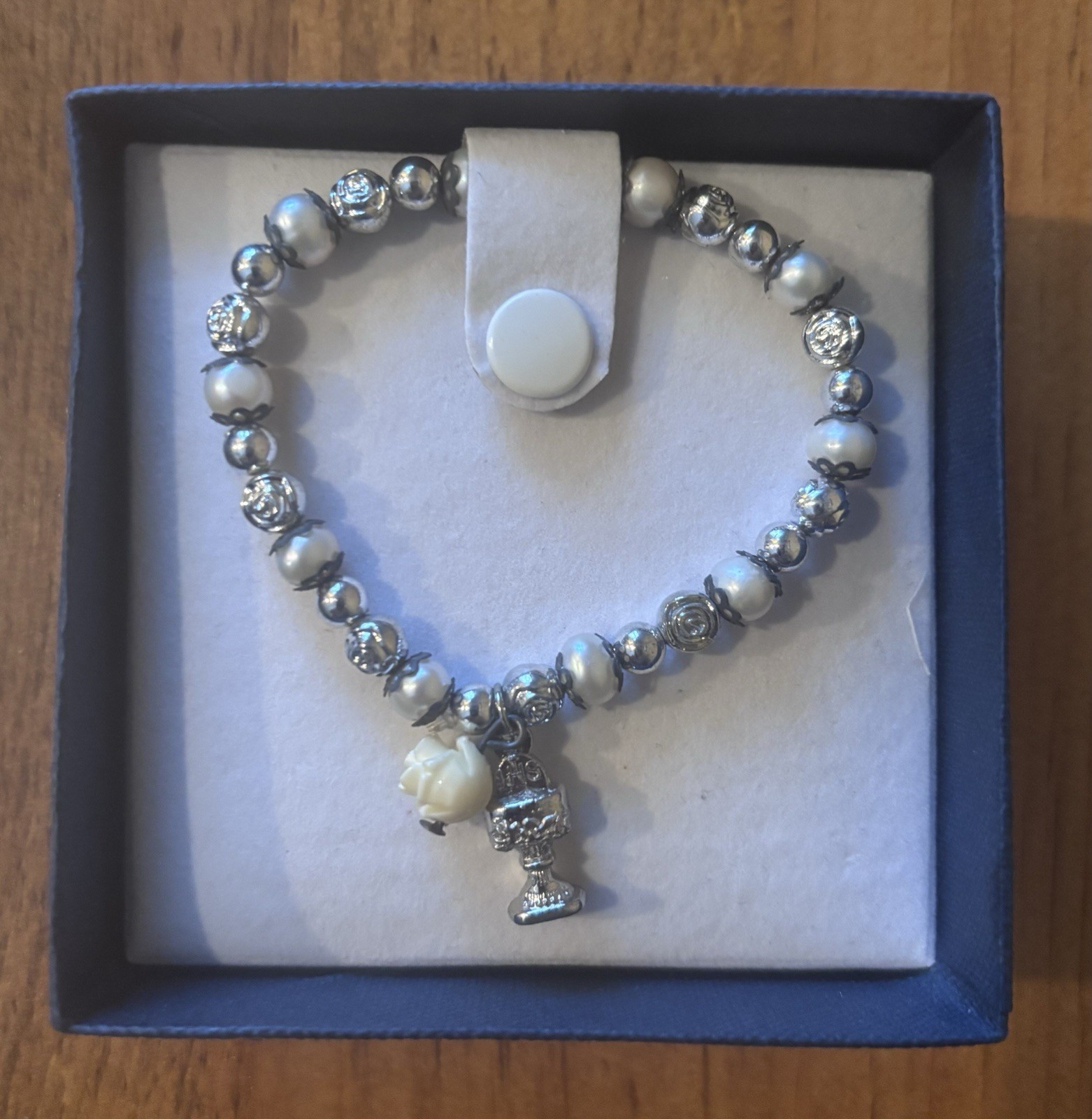 GIRLS FIRST COMMUNION PEARL SILVER BEADED BRACELET w/ Chalice and Rose Charm