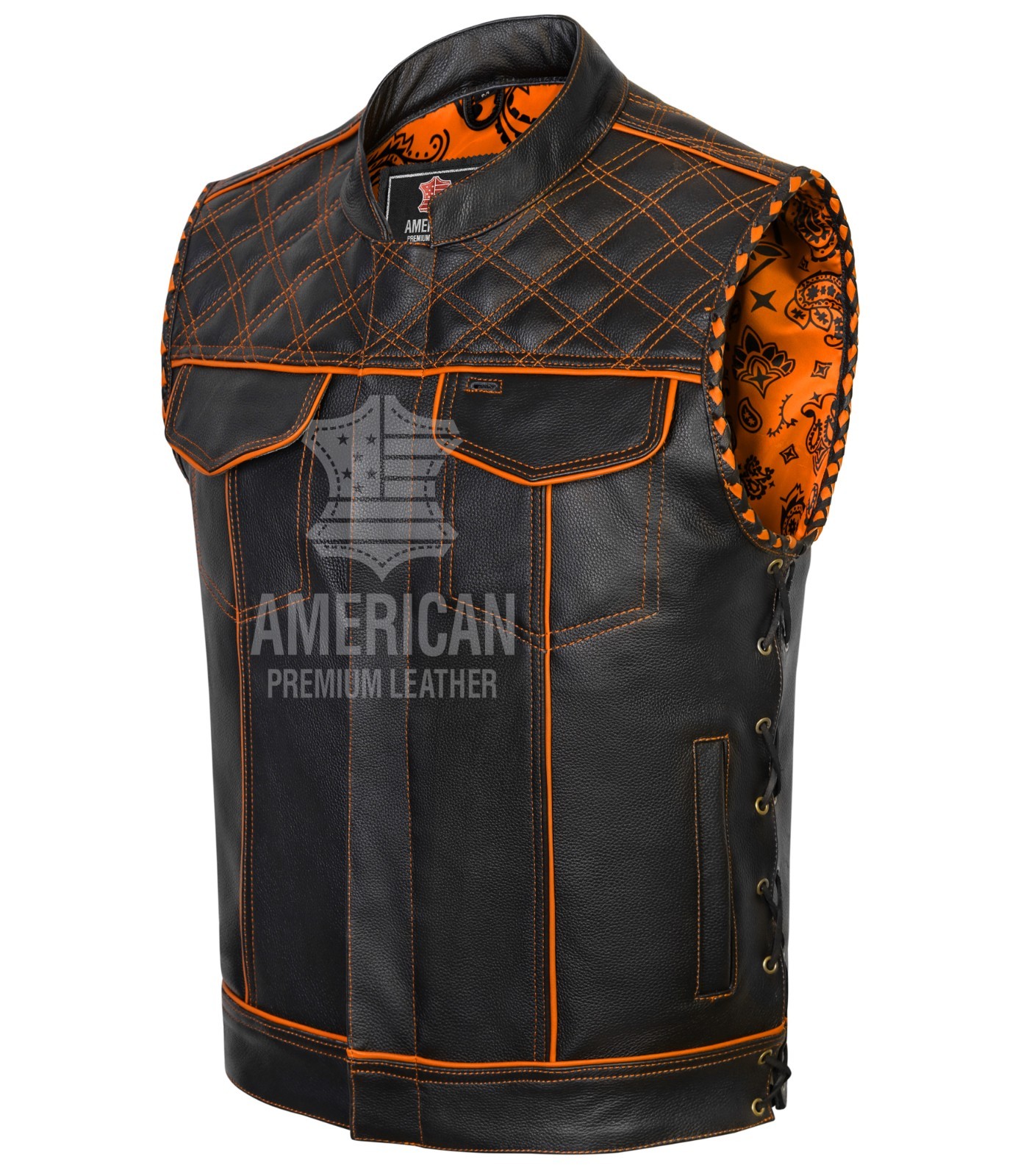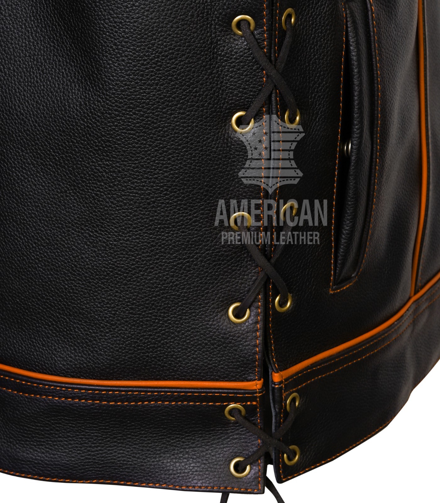 Men s Black Orange Leather Motorcycle Vest Diamond, Side Lace, Concealed Carry