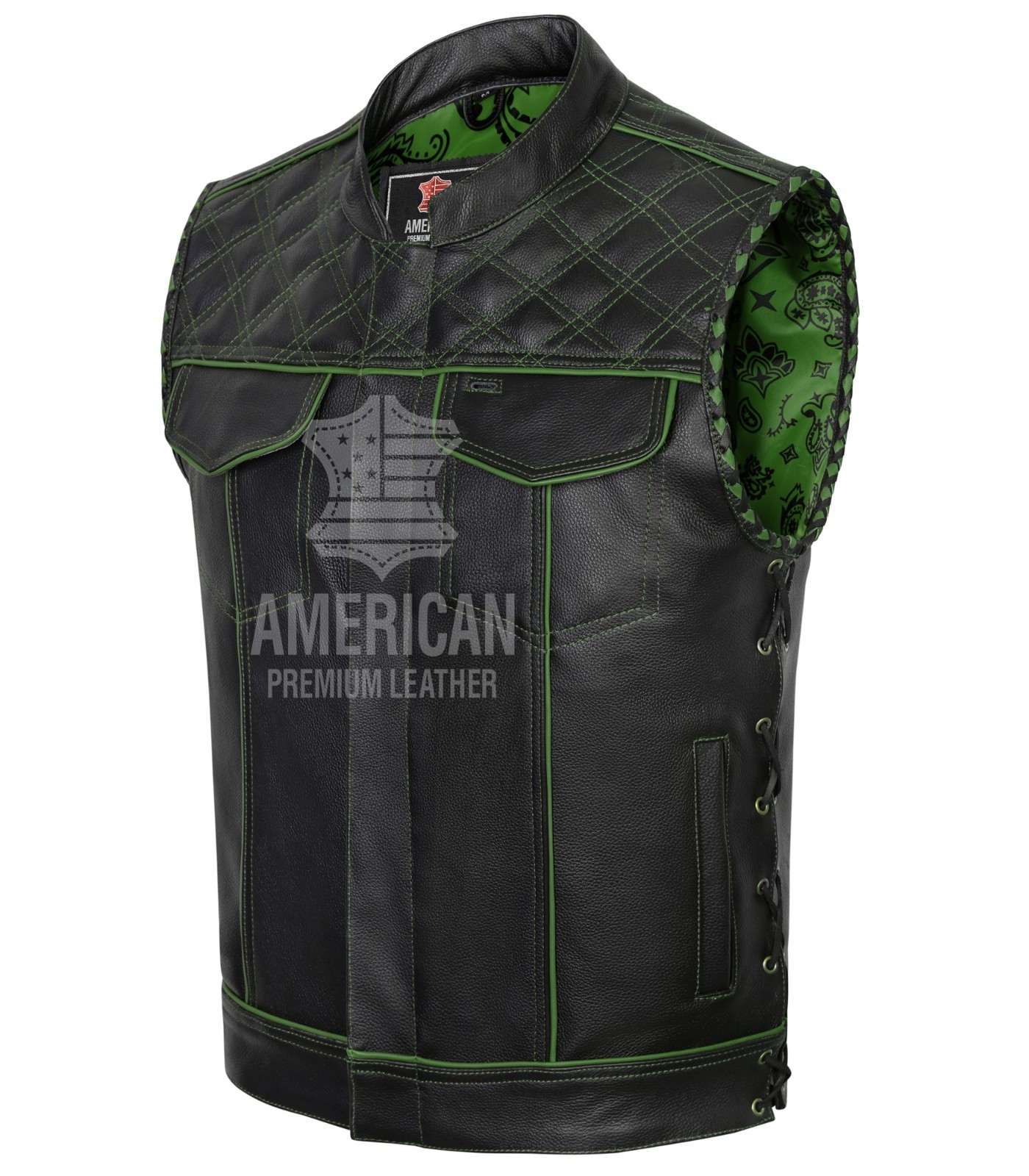 Men s Black Green Leather Motorcycle Vest Diamond, Side Lace, Concealed Carry