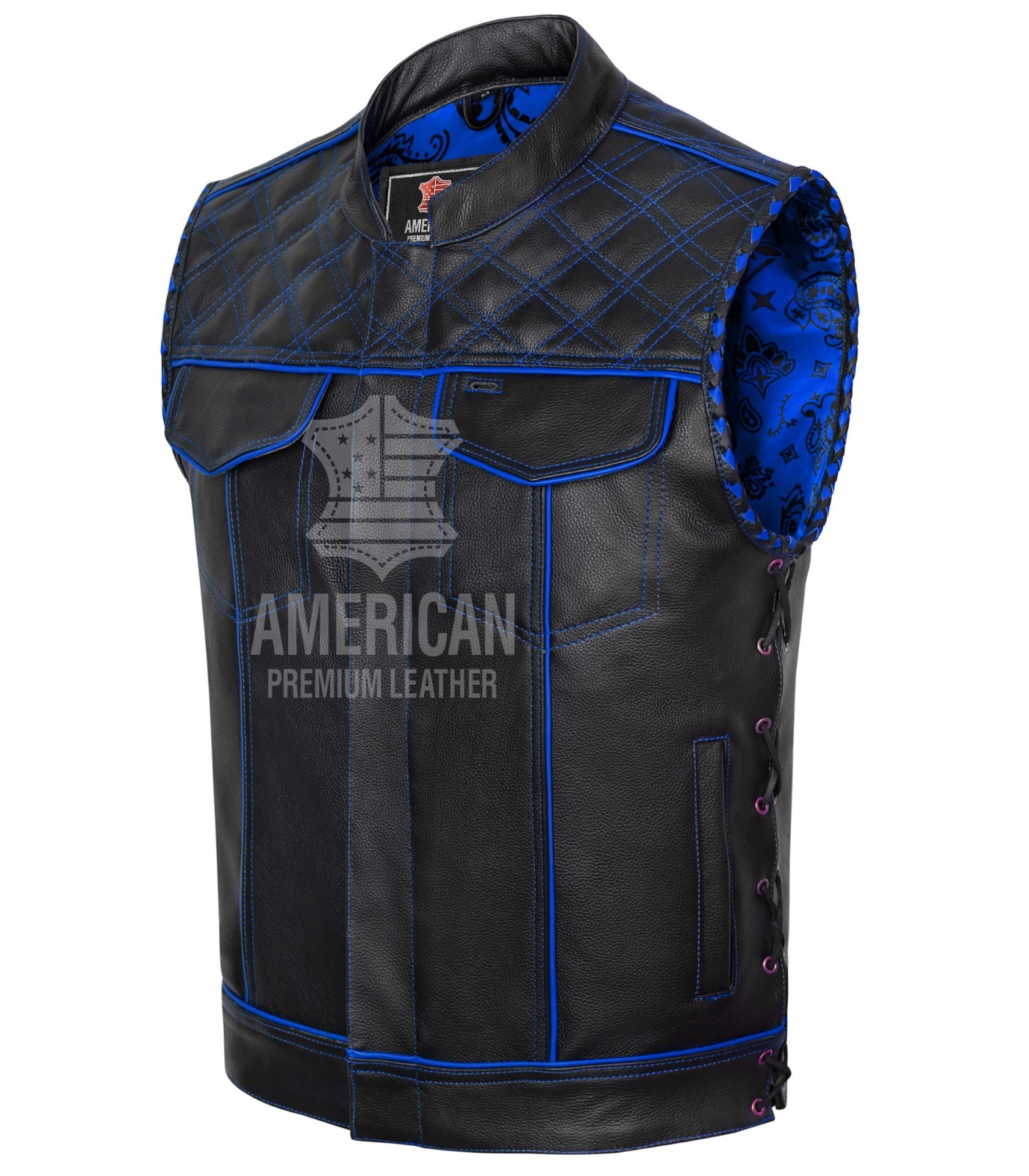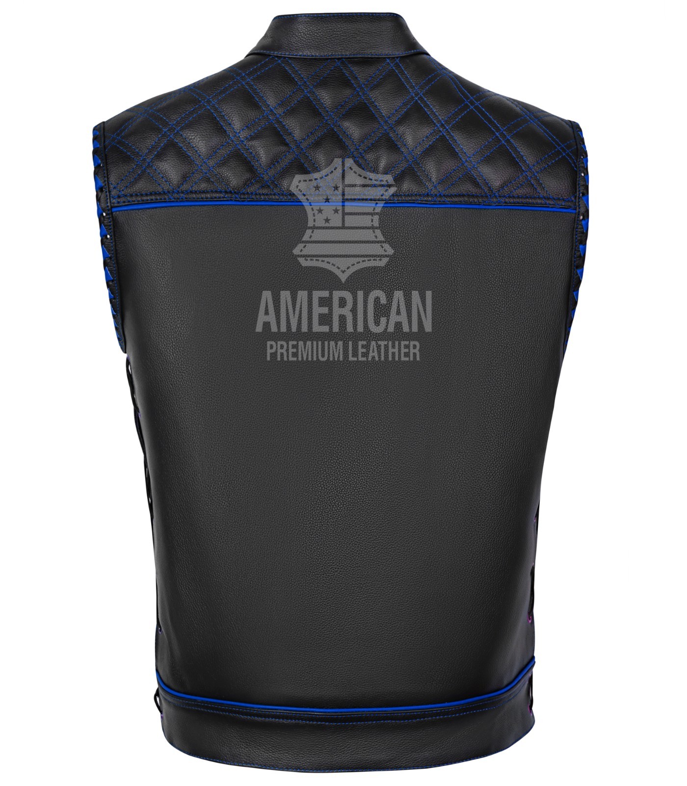 Men s Black Blue Leather Motorcycle Vest Diamond, Side Lace, Concealed Carry