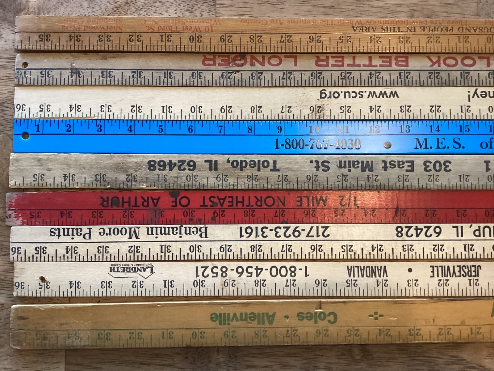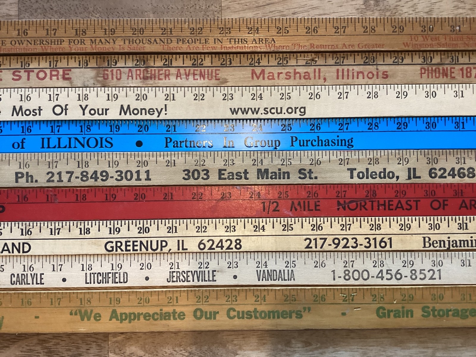 • Lot of 9 Vintage Wooden Yardsticks Advertising