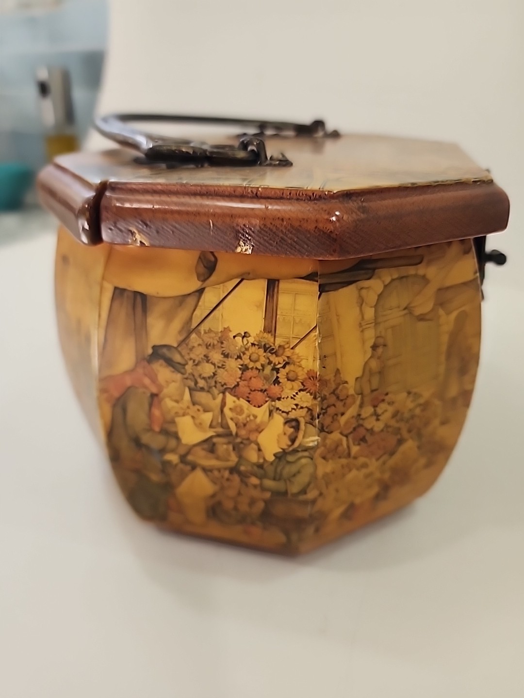 как выглядит Vintage Anton Pieck Decoupage Wooden Box Purse Octagon Metal Handle фото