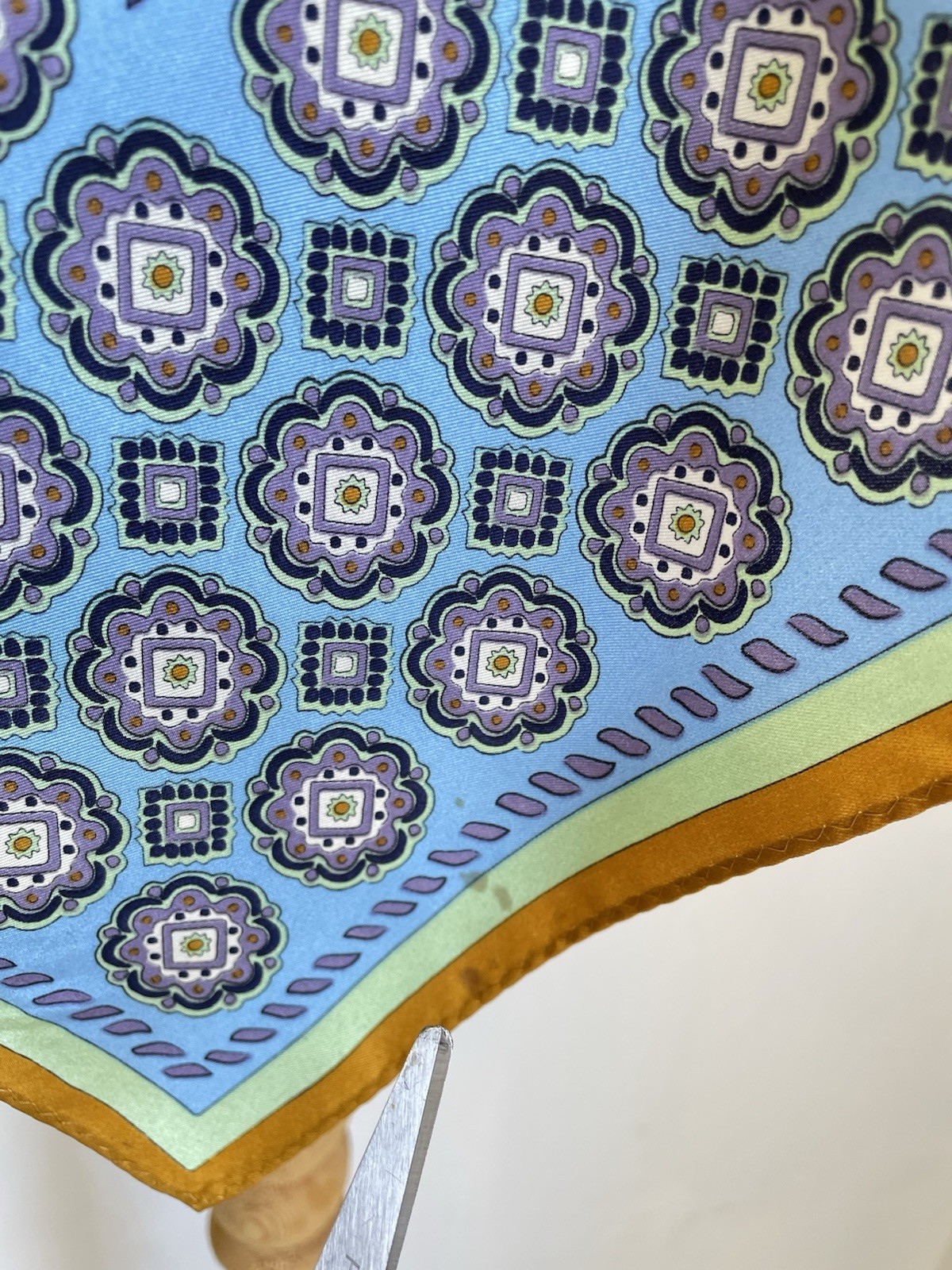 H75 Vintage Paisley Print Square Scarf Blue Purple Gold Satin Feel