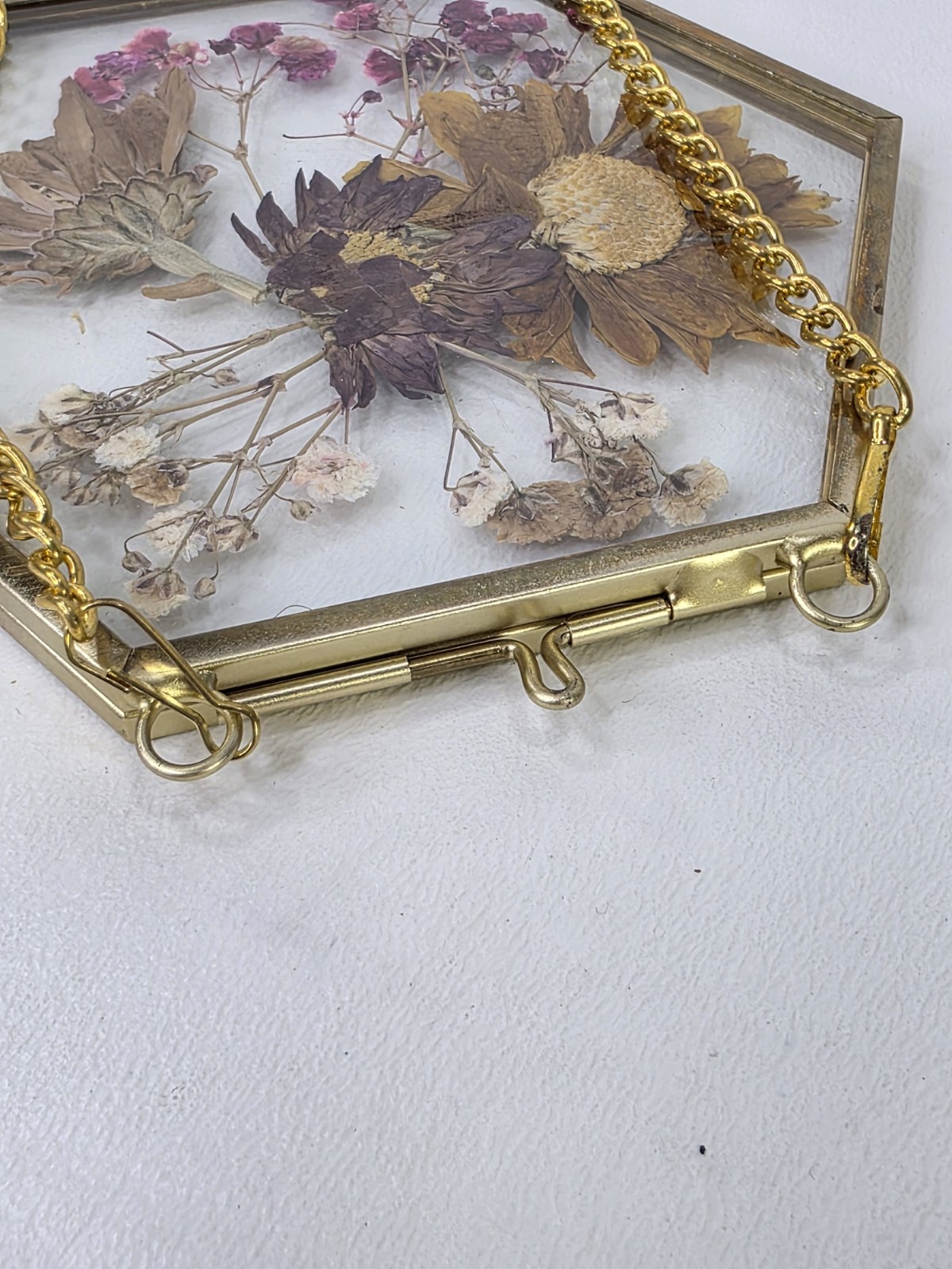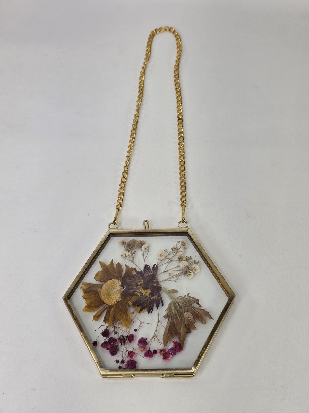 • Pressed Flower Art Hexagon Glass Frame Gold Chain Hanging Botanical Decor 4"