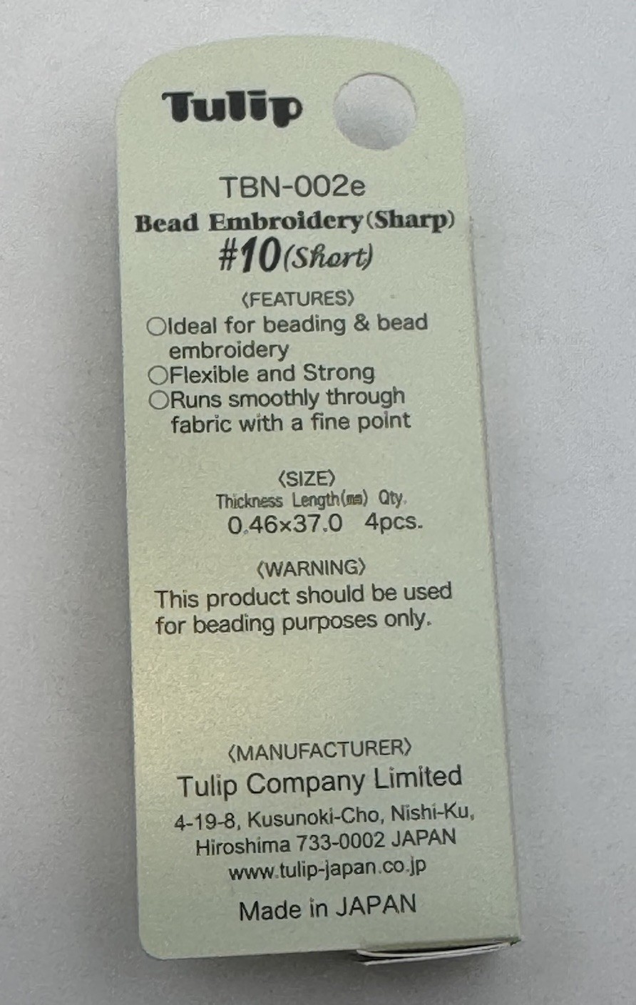 Tulip Bead Embroidery sharp 10 SHORT Beading Needles - 4pc