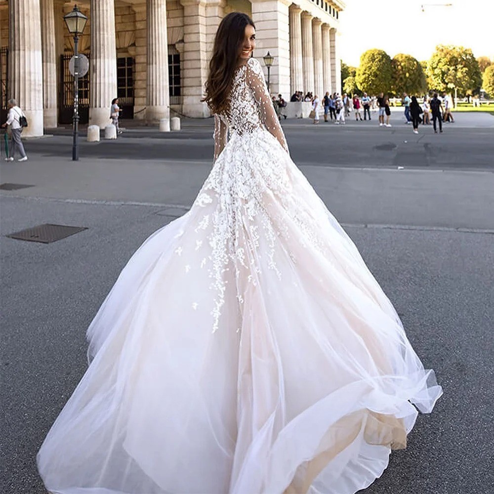 Vintage Wedding Dresses Long Sleeves Tulle Applique Bridal Gown Sweep Train