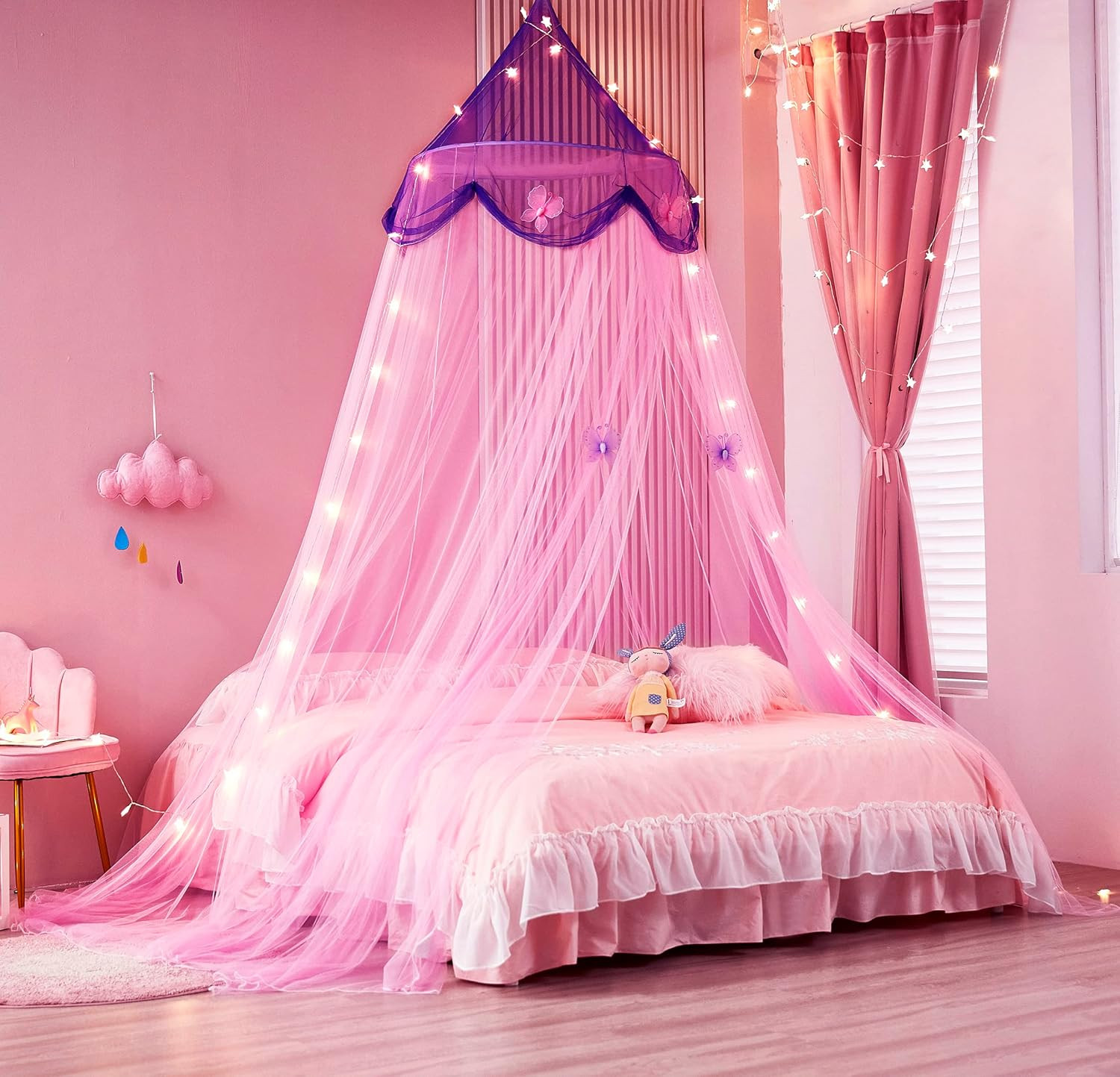 Girls Bed Canopy With Lights Purple Pink Mosquito Net Twin To King Size