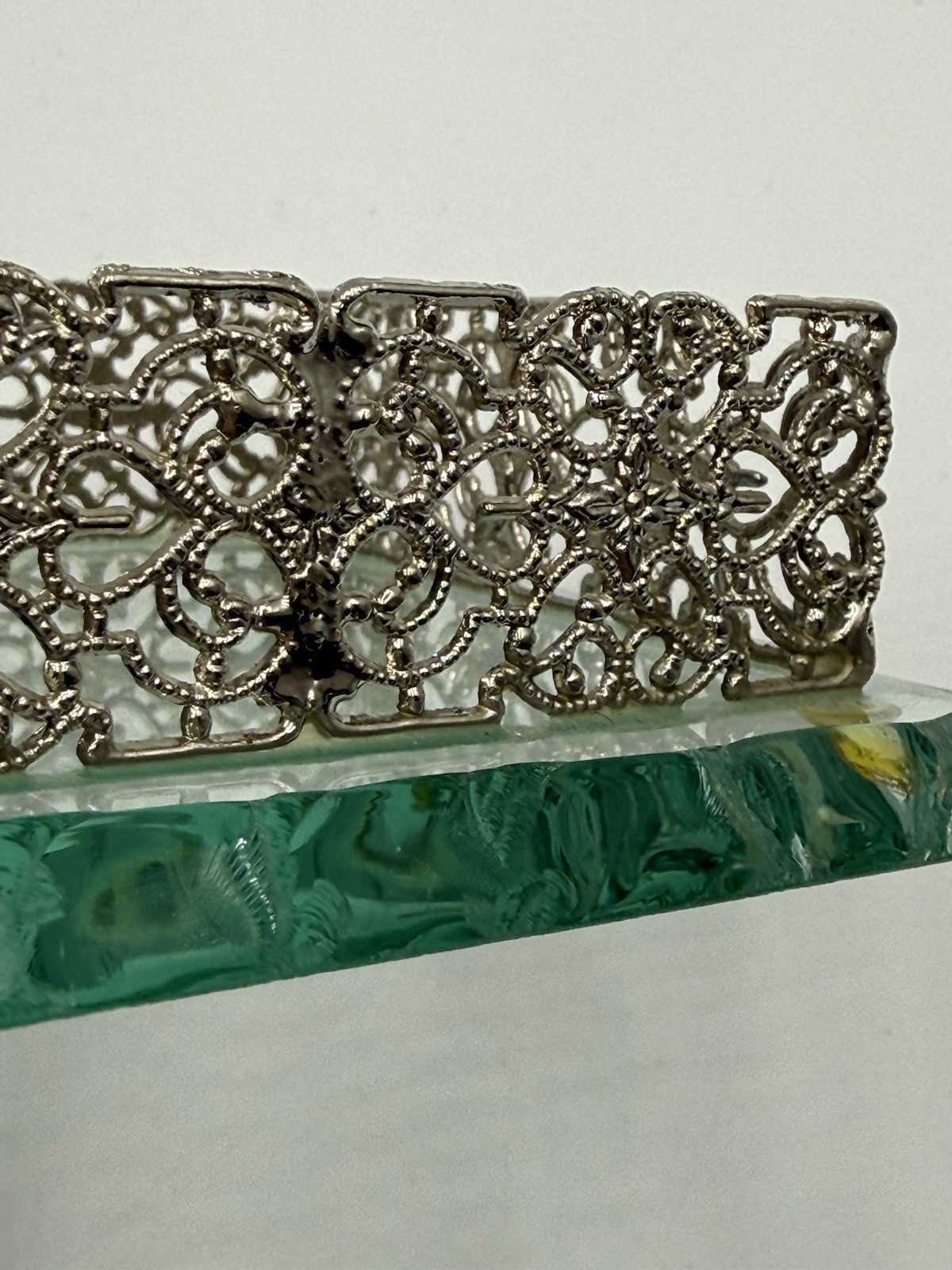• Glass Jewelry Trinket Box Ornate Silver Filligree Metal Iridescent Art Glass Lid