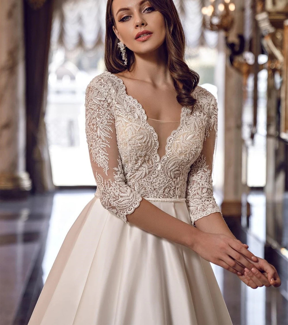 как выглядит Elegant Lace Appliques A-Line Wedding Dresses Half Sleeves V Neck Bridal Gowns фото