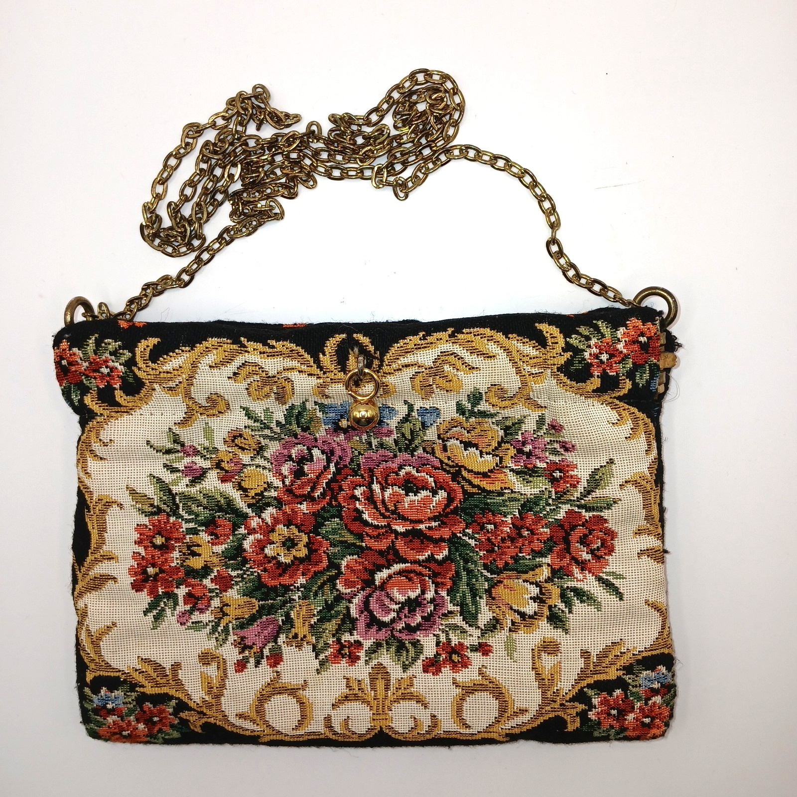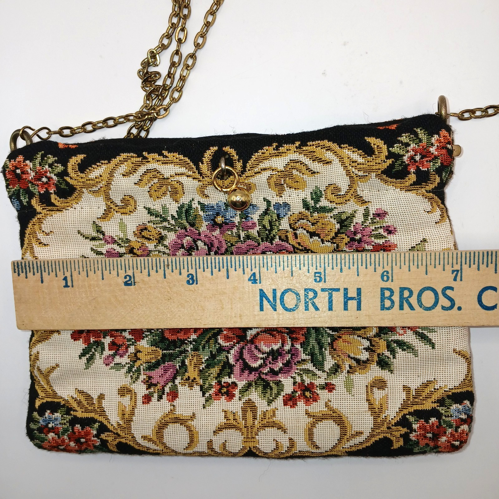 Vtg Black Red Roses Floral Tapestry Petit Point Purse Shoulder Bag Snap Frame