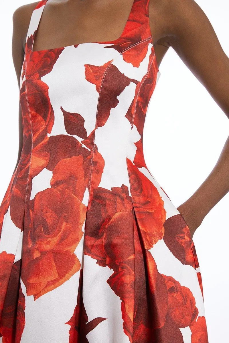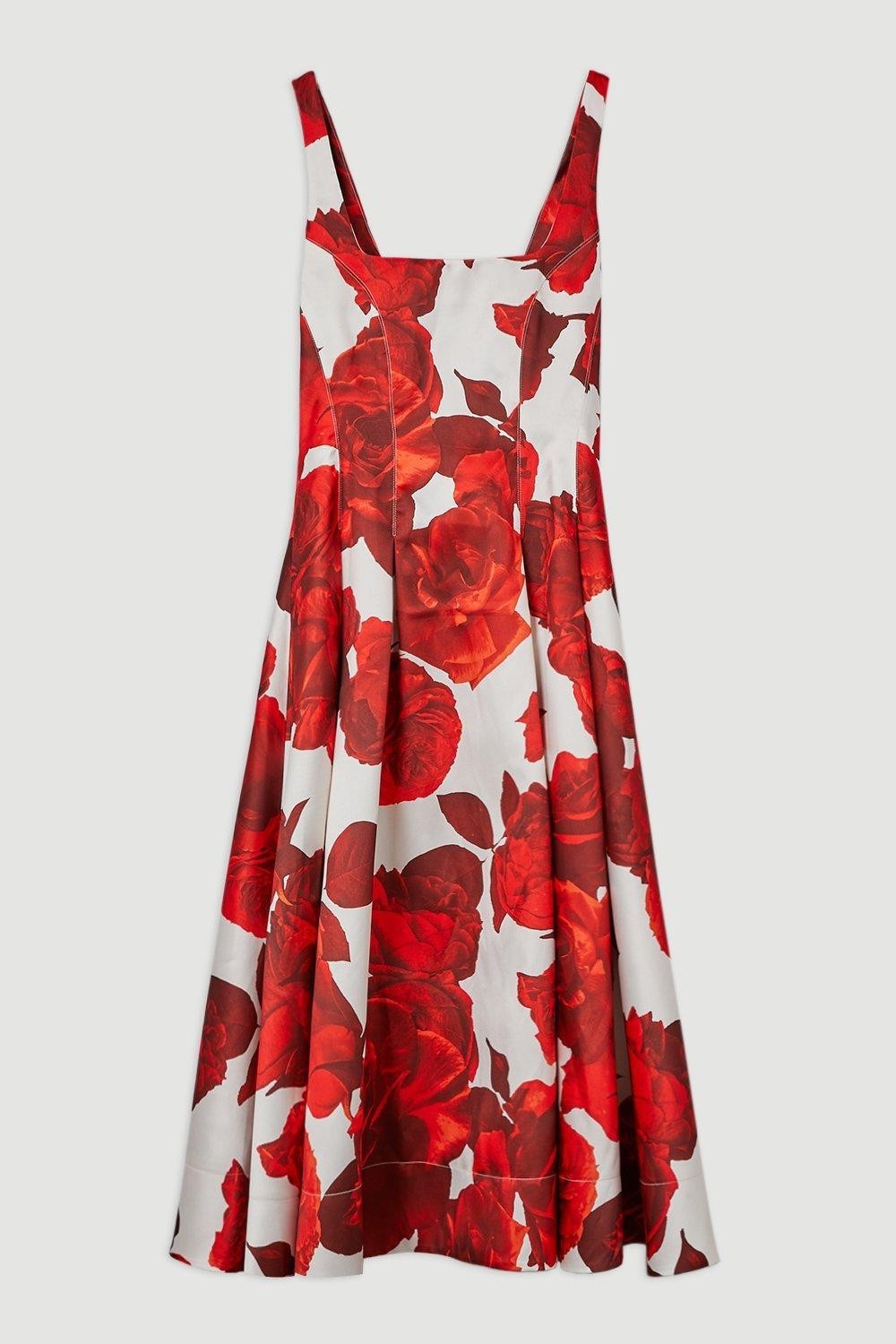 как выглядит Karen Millen Womens Red Rose Floral Twill Prom Dress Sz 4 Holiday Party NWT фото