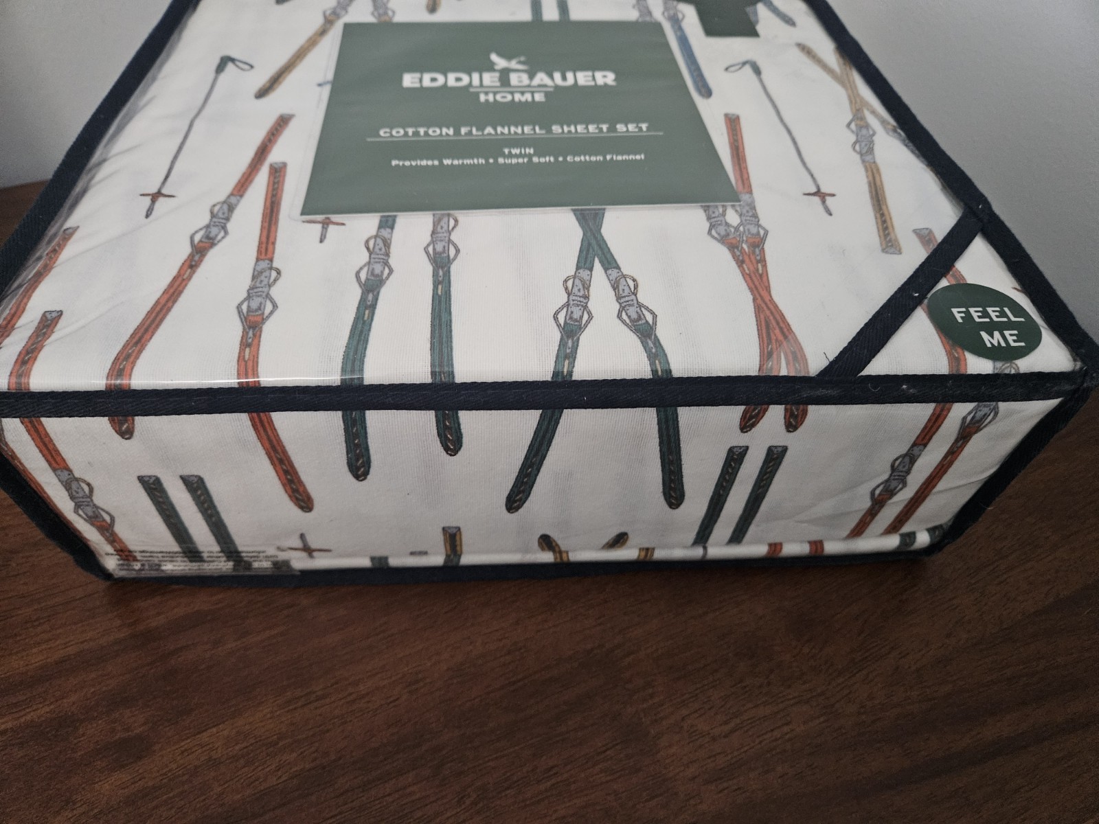как выглядит Eddie Bauer Cotton Flannel Twin Sheet Set Ski Line-Light Ivory Orange Blue NIP фото