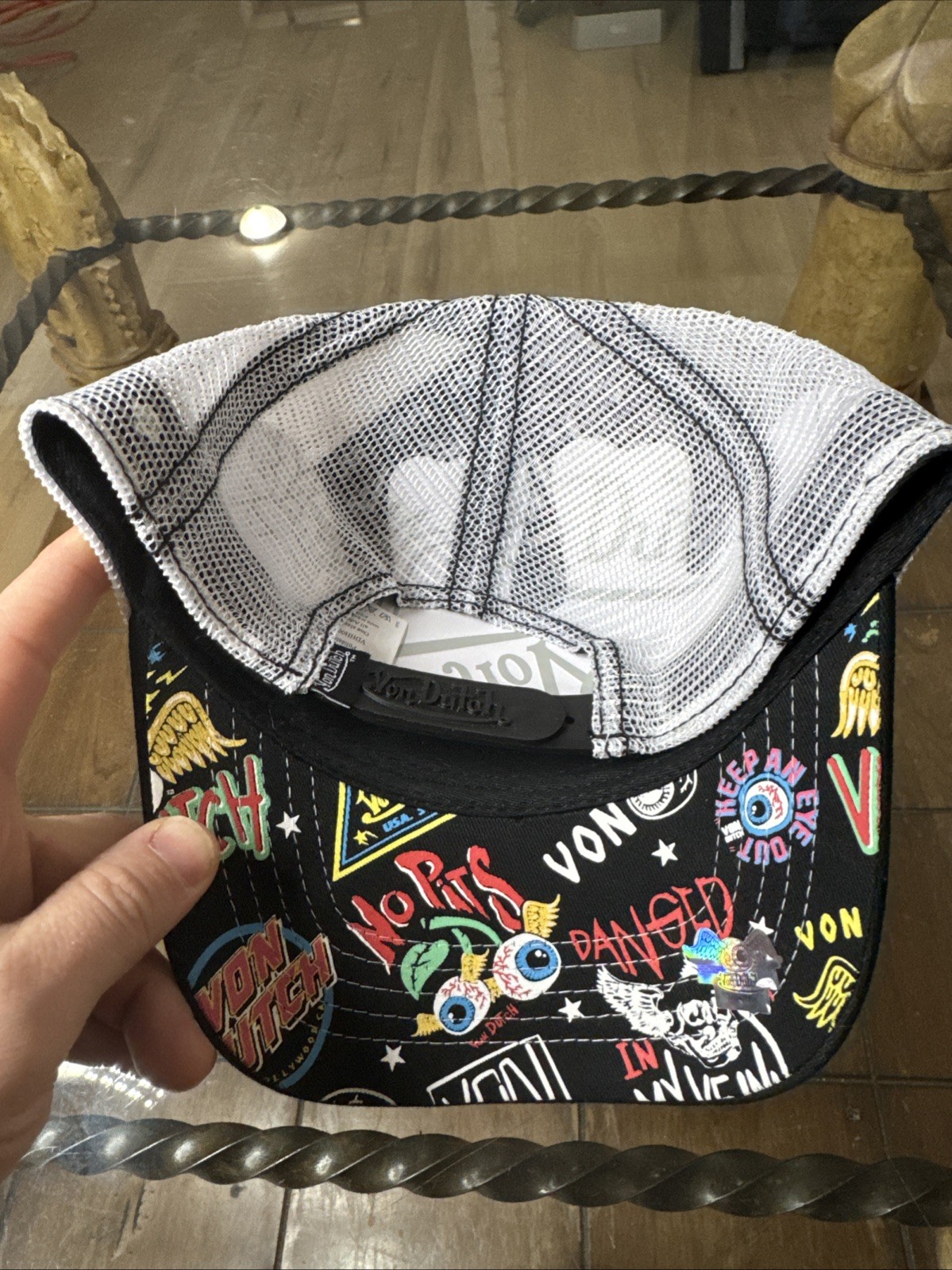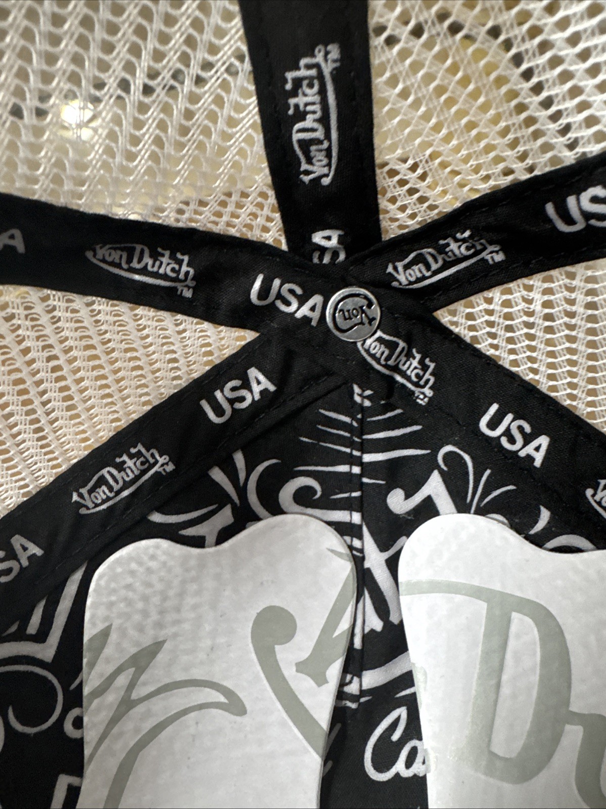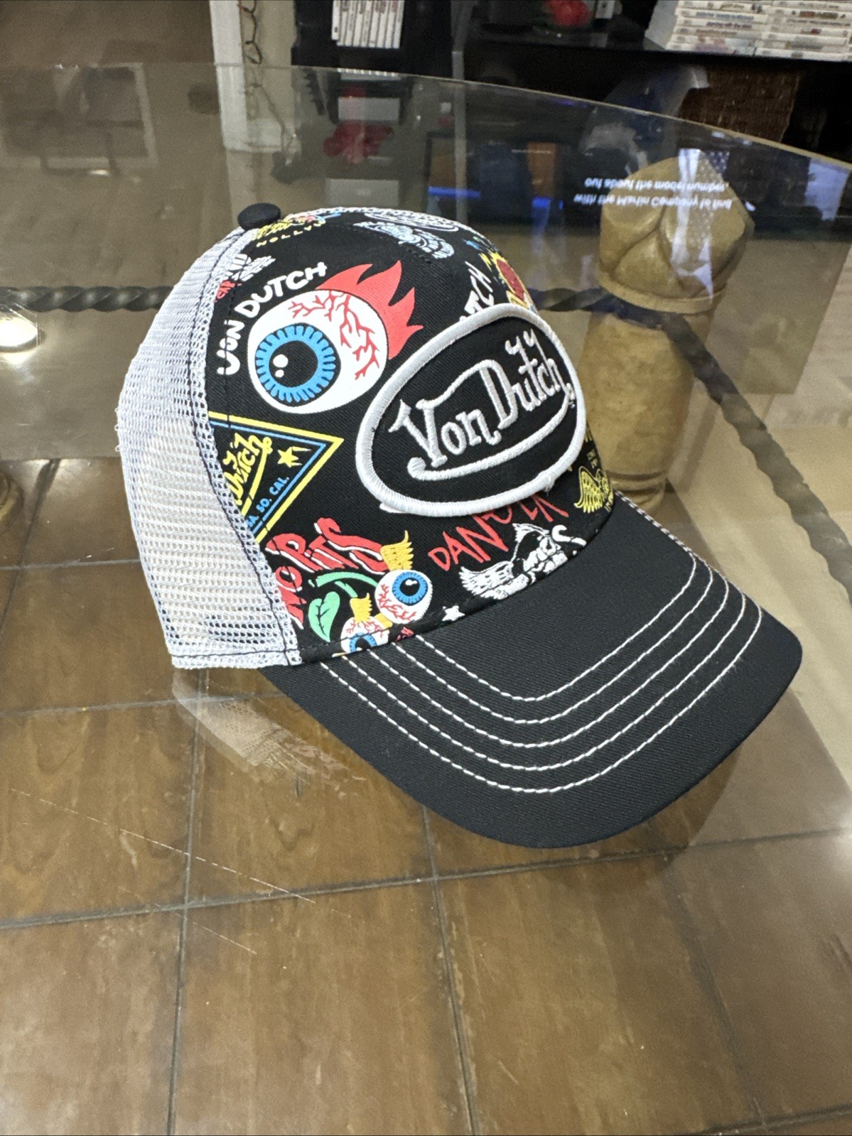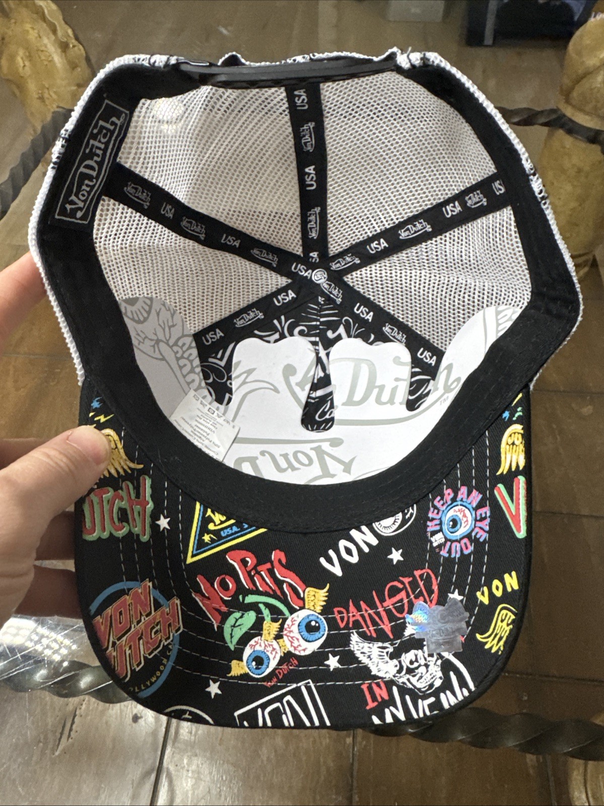 Von Dutch Jax Black Trucker Cap NWOT Embroidered All Over Logo OSFA Hat Mesh