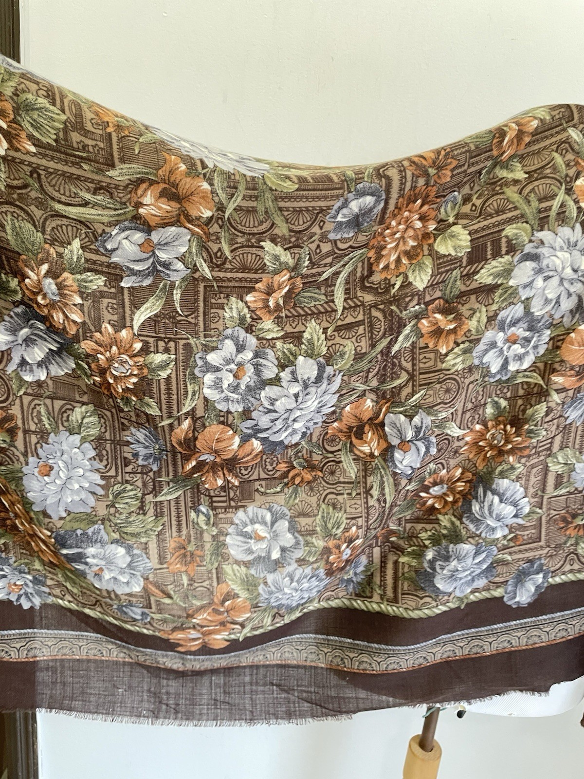 как выглядит H81 VTG Floral Square Scarf Brown Multicolor Classic Pattern Fringed Lightweight фото