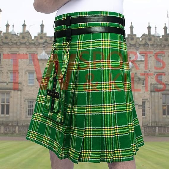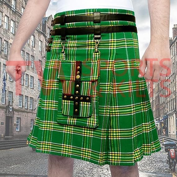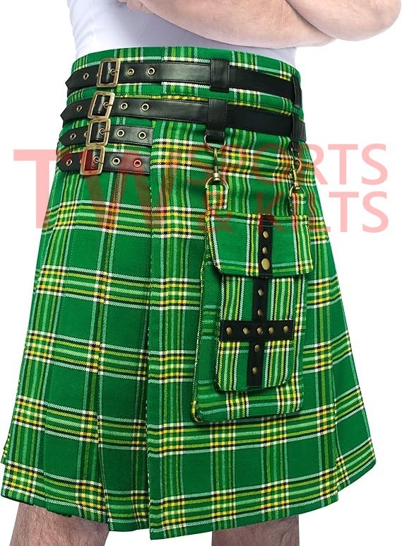 Designer Irish Green Tartan Utility Kilt With Leather Straps Black Kilt Socks