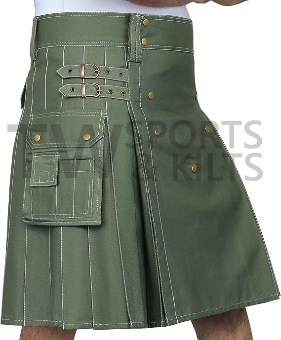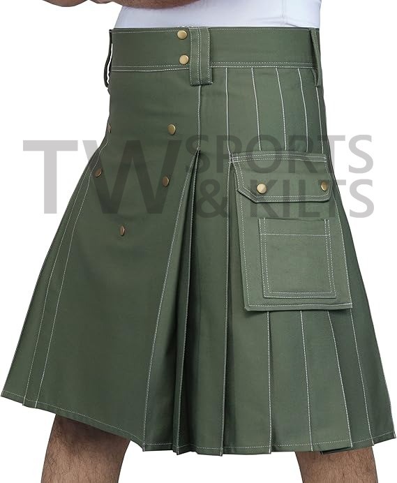 Men's Olive Utility Kilt Made Of Cotton Material Two Side Pockets Front Button
