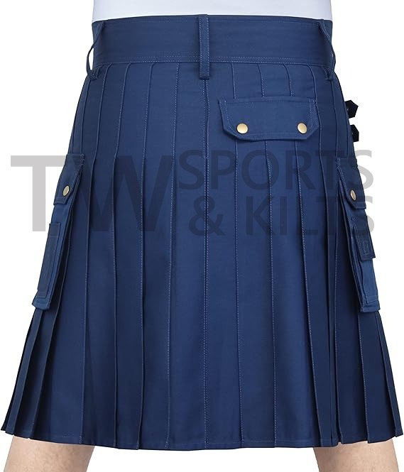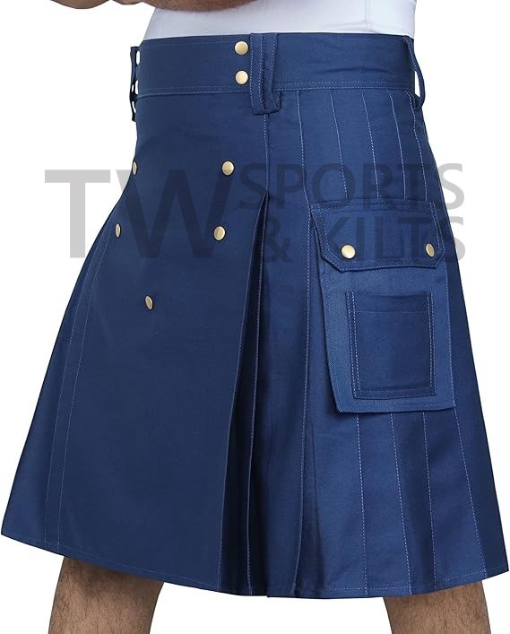 Men's Blue Utility Kilt Made Of Cotton Material Two Side Pockets Front Button